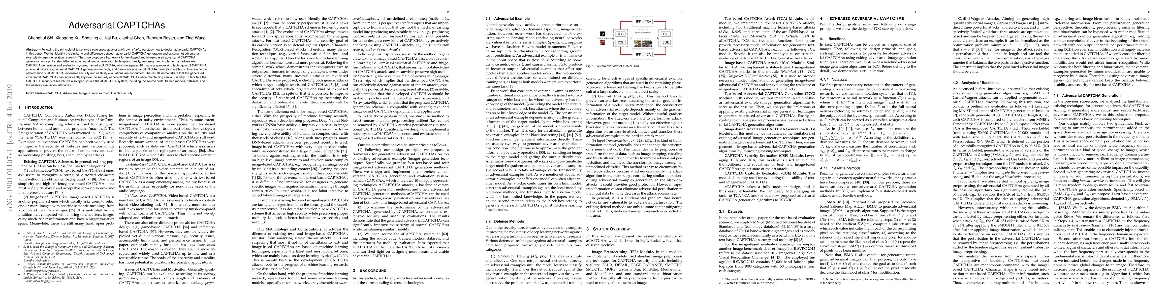 This paper proposes a framework for generating adversarial CAPTCHAs, integrating advanced image generation techniques and 10 preprocessing methods. It demonstrates that these adversarial CAPTCHAs enhance security while maintaining usability, and the system, aCAPTCHA, is open-sourced to support further research.