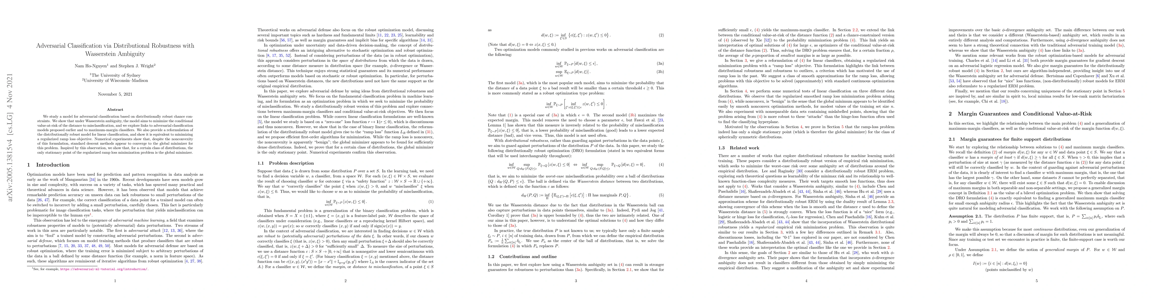 The paper proposes a model for adversarial classification using distributionally robust chance constraints under Wasserstein ambiguity, showing it minimizes the conditional value-at-risk of the distance to misclassification. It also provides a reformulation for linear classification equivalent to minimizing a regularized ramp loss objective.