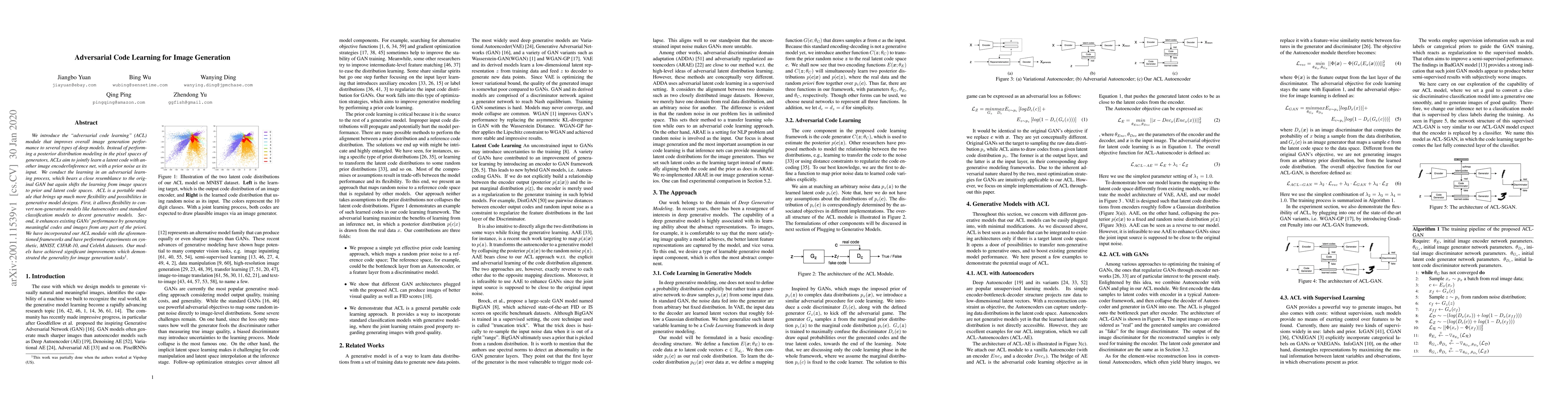 The paper proposes "adversarial code learning" (ACL) to enhance image generation performance across various deep models by jointly learning a latent code with an encoder/inference net, improving flexibility and generative capabilities. Experiments on multiple datasets show significant improvements, demonstrating ACL's effectiveness in diverse image generation tasks.
