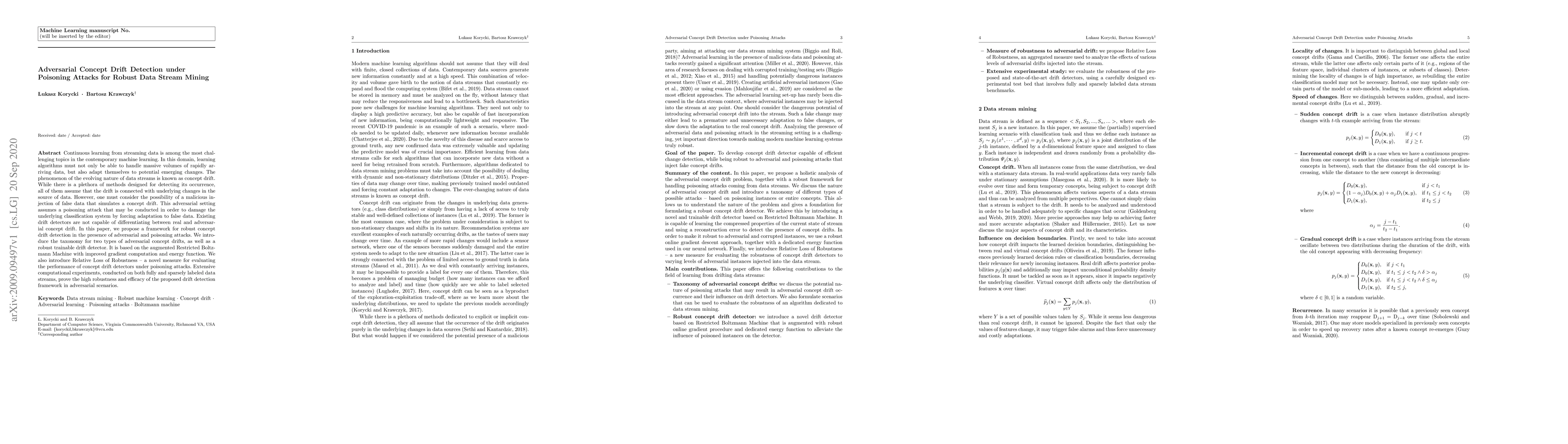 This paper proposes a framework for detecting adversarial concept drift in data streams amidst poisoning attacks, introducing a taxonomy for two types of adversarial drifts and a robust trainable drift detector based on an augmented Restricted Boltzmann Machine. It also evaluates the framework's performance using a novel measure, demonstrating high robustness and efficacy through extensive computational experiments.