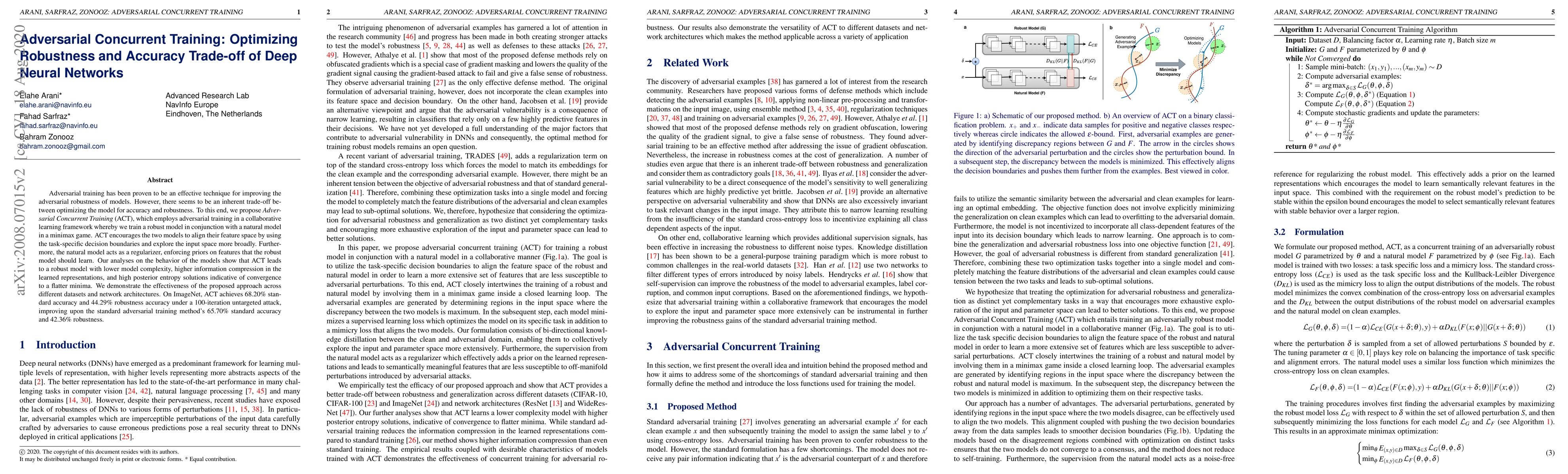 Adversarial Concurrent Training (ACT) proposes a collaborative learning framework to optimize both accuracy and robustness in deep neural networks by training a robust model alongside a natural model in a minimax game. ACT achieves higher standard and robustness accuracy on ImageNet compared to standard adversarial training.