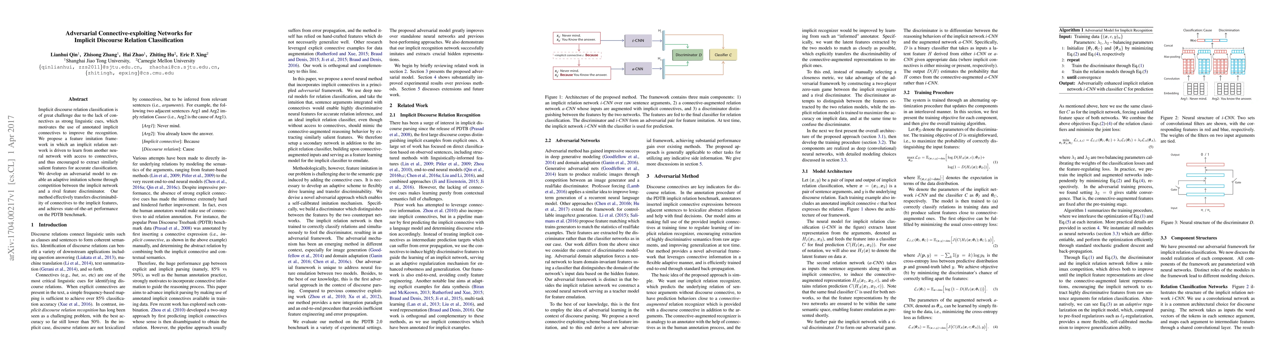 This paper proposes an adversarial connective-exploiting network to improve implicit discourse relation classification, leveraging an implicit relation network trained to mimic a connective-aware network through an adversarial model, achieving top performance on the PDTB benchmark.