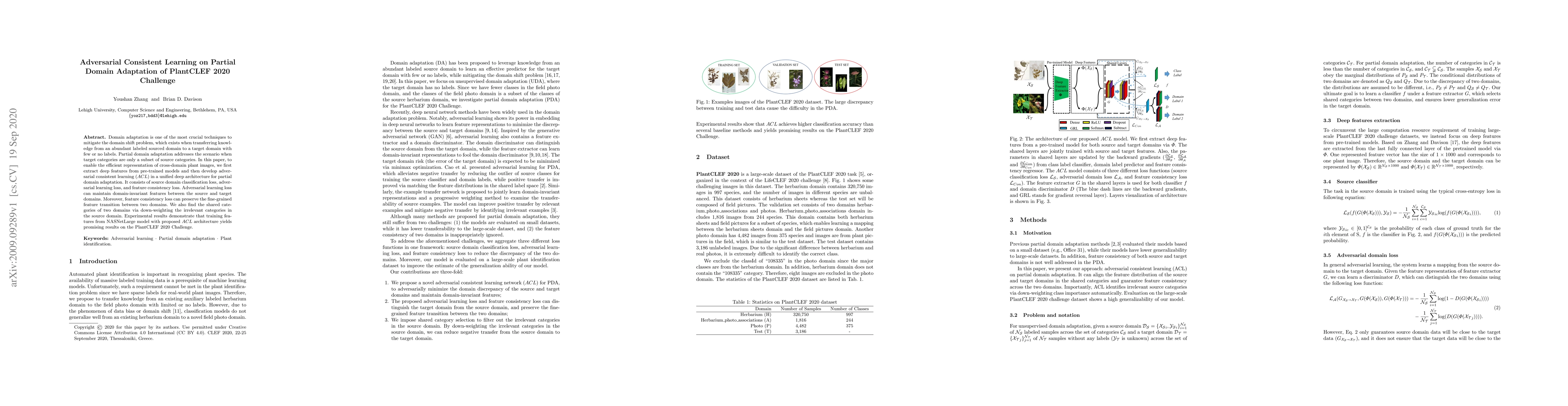 This paper proposes an adversarial consistent learning (ACL) framework for partial domain adaptation in plant image classification, addressing the domain shift problem. The ACL architecture combines source domain classification, adversarial learning, and feature consistency losses to achieve domain-invariant feature representation and fine-grained feature transition, leading to improved performance on the PlantCLEF 2020 Challenge.