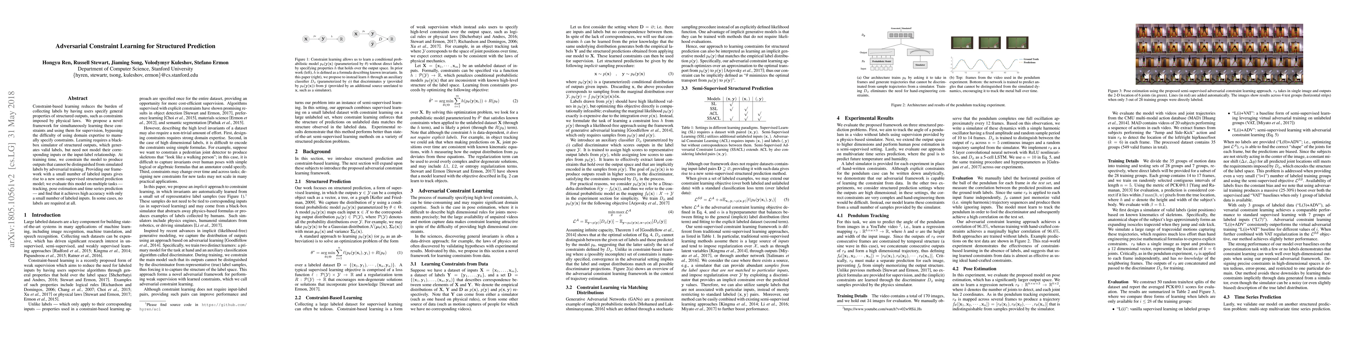 Constraint-based learning reduces the burden of collecting labels by having users specify general properties of structured outputs, such as constraints imposed by physical laws. We propose a novel framework for simultaneously learning these constraints and using them for supervision, bypassing the difficulty of using domain expertise to manually specify constraints. Learning requires a black-box simulator of structured outputs, which generates valid labels, but need not model their corresponding inputs or the input-label relationship. At training time, we constrain the model to produce outputs that cannot be distinguished from simulated labels by adversarial training. Providing our framework with a small number of labeled inputs gives rise to a new semi-supervised structured prediction model; we evaluate this model on multiple tasks --- tracking, pose estimation and time series prediction --- and find that it achieves high accuracy with only a small number of labeled inputs. In some cases, no labels are required at all.