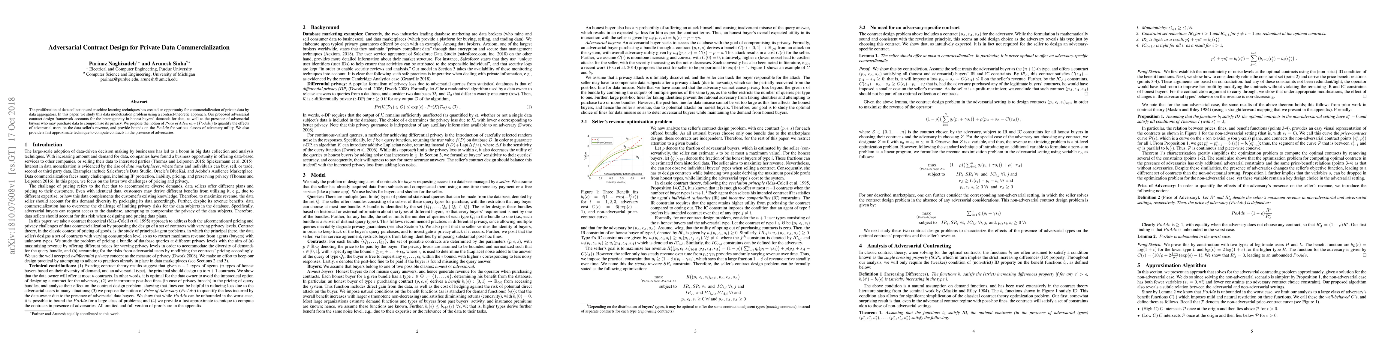 The proliferation of data collection and machine learning techniques has created an opportunity for commercialization of private data by data aggregators. In this paper, we study this data monetization problem using a contract-theoretic approach. Our proposed adversarial contract design framework accounts for the heterogeneity in honest buyers' demands for data, as well as the presence of adversarial buyers who may purchase data to compromise its privacy. We propose the notion of Price of Adversary (PoAdv) to quantify the effects of adversarial users on the data seller's revenue, and provide bounds on the PoAdv for various classes of adversary utility. We also provide a fast approximate technique to compute contracts in the presence of adversaries.