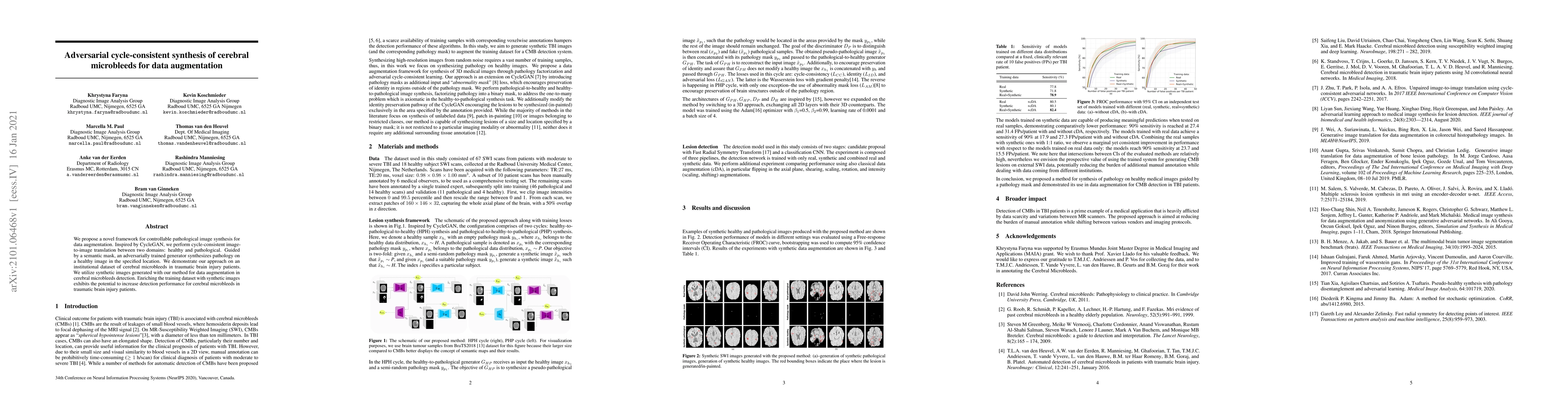This paper proposes a novel adversarial cycle-consistent framework for synthesizing cerebral microbleeds on healthy brain images, leveraging CycleGAN for data augmentation to enhance detection performance in traumatic brain injury patients. Synthetic images are used to enrich training datasets, potentially improving detection accuracy.