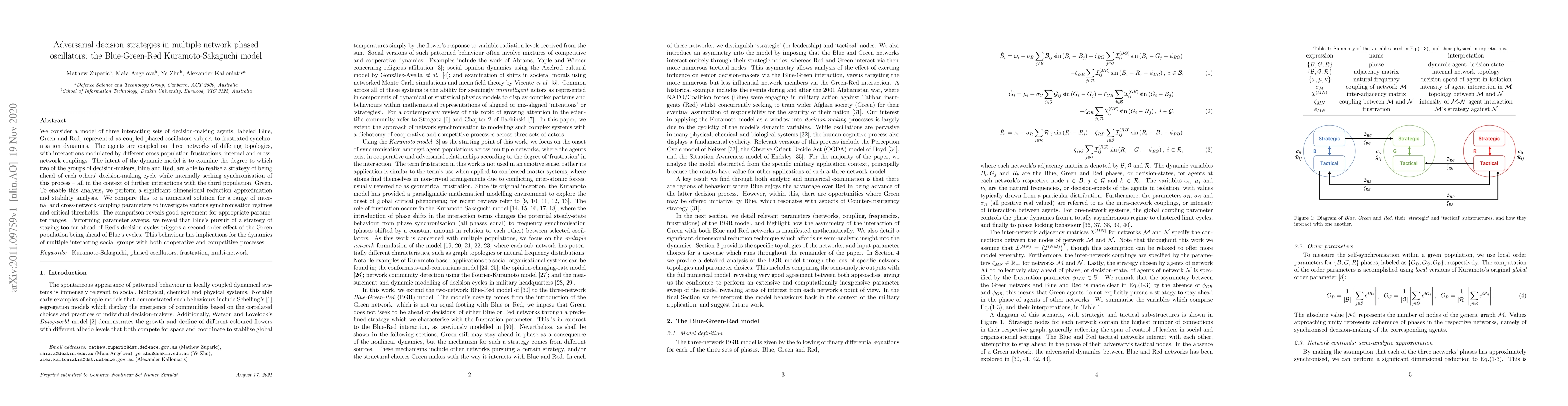 We consider a model of three interacting sets of decision-making agents, labeled Blue, Green and Red, represented as coupled phased oscillators subject to frustrated synchronisation dynamics. The agents are coupled on three networks of differing topologies, with interactions modulated by different cross-population frustrations, internal and cross-network couplings. The intent of the dynamic model is to examine the degree to which two of the groups of decision-makers, Blue and Red, are able to realise a strategy of being ahead of each others' decision-making cycle while internally seeking synchronisation of this process -- all in the context of further interactions with the third population, Green. To enable this analysis, we perform a significant dimensional reduction approximation and stability analysis. We compare this to a numerical solution for a range of internal and cross-network coupling parameters to investigate various synchronisation regimes and critical thresholds. The comparison reveals good agreement for appropriate parameter ranges. Performing parameter sweeps, we reveal that Blue's pursuit of a strategy of staying too-far ahead of Red's decision cycles triggers a second-order effect of the Green population being ahead of Blue's cycles. This behaviour has implications for the dynamics of multiple interacting social groups with both cooperative and competitive processes.