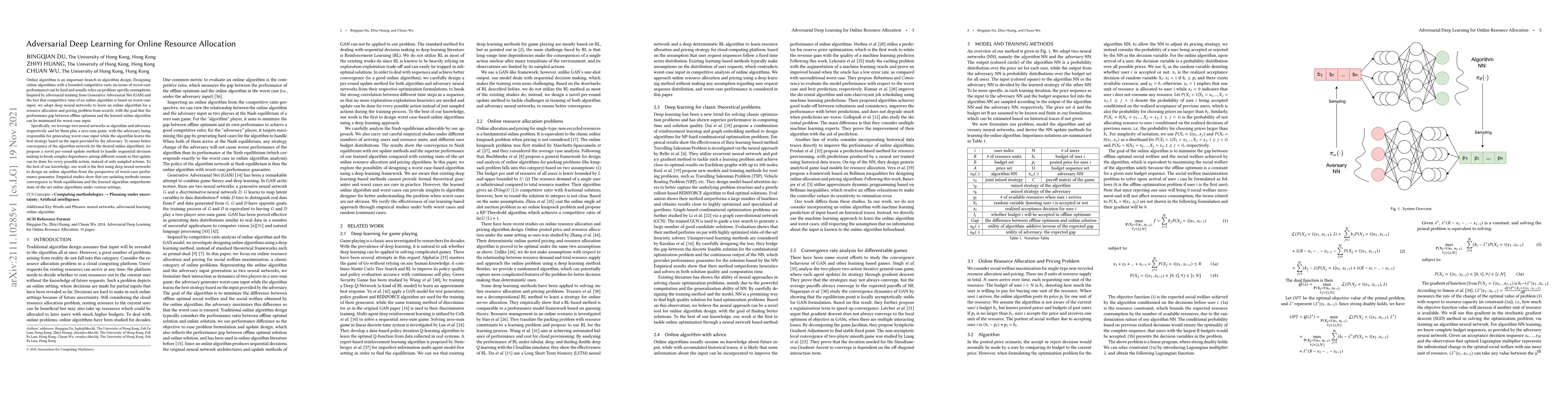 This paper proposes a novel adversarial deep learning approach to design online algorithms for resource allocation and pricing, leveraging neural networks to minimize the performance gap between offline optimum and learned online algorithms under worst-case inputs. The method involves a zero-sum game between an algorithm and adversary network, with a new per-round update method ensuring convergence to Nash equilibrium and outperforming existing online algorithms.