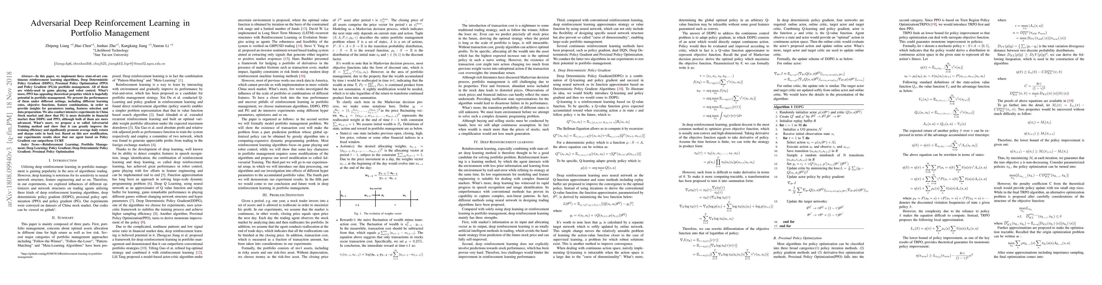 In this paper, we implement three state-of-art continuous reinforcement learning algorithms, Deep Deterministic Policy Gradient (DDPG), Proximal Policy Optimization (PPO) and Policy Gradient (PG)in portfolio management. All of them are widely-used in game playing and robot control. What's more, PPO has appealing theoretical propeties which is hopefully potential in portfolio management. We present the performances of them under different settings, including different learning rates, objective functions, feature combinations, in order to provide insights for parameters tuning, features selection and data preparation. We also conduct intensive experiments in China Stock market and show that PG is more desirable in financial market than DDPG and PPO, although both of them are more advanced. What's more, we propose a so called Adversarial Training method and show that it can greatly improve the training efficiency and significantly promote average daily return and sharpe ratio in back test. Based on this new modification, our experiments results show that our agent based on Policy Gradient can outperform UCRP.