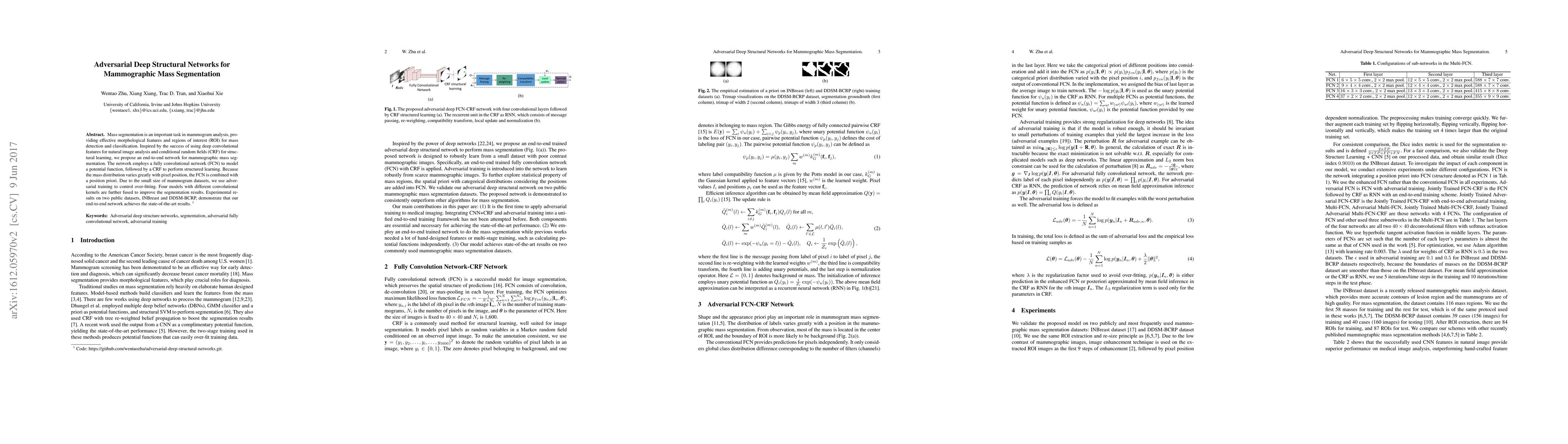 This paper proposes an end-to-end adversarial deep structural network for mammographic mass segmentation, combining a fully convolutional network with conditional random fields and adversarial training to achieve state-of-the-art results on INbreast and DDSM-BCRP datasets.