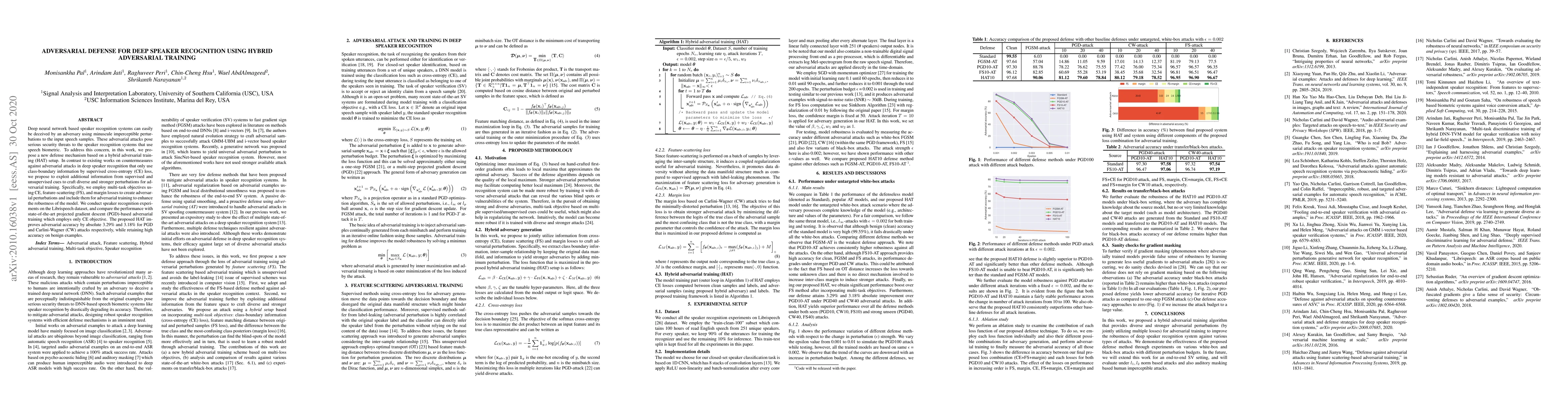 This paper proposes a hybrid adversarial training (HAT) method to defend deep speaker recognition systems against adversarial attacks, using multi-task objectives including supervised and unsupervised cues. The HAT approach improves robustness against PGD and CW attacks by 3.29% and 3.18% respectively, while maintaining high accuracy on benign samples.