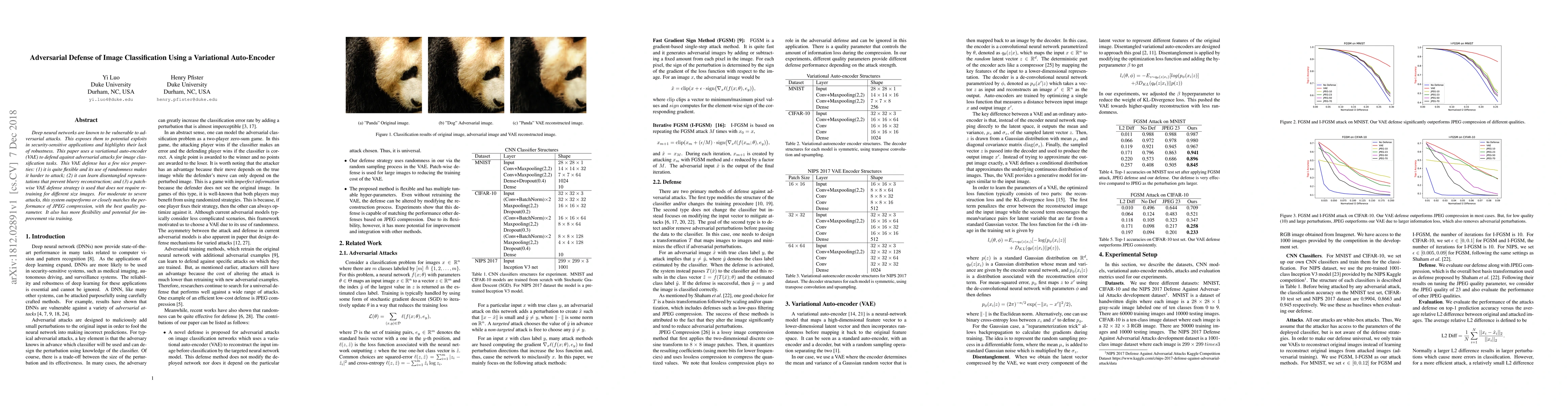 This paper proposes a variational auto-encoder (VAE) defense against adversarial attacks in image classification, which leverages randomness and disentangled representations for robustness. The patch-wise VAE strategy offers flexibility without needing retraining for different image sizes, and performs competitively against moderate to severe attacks.