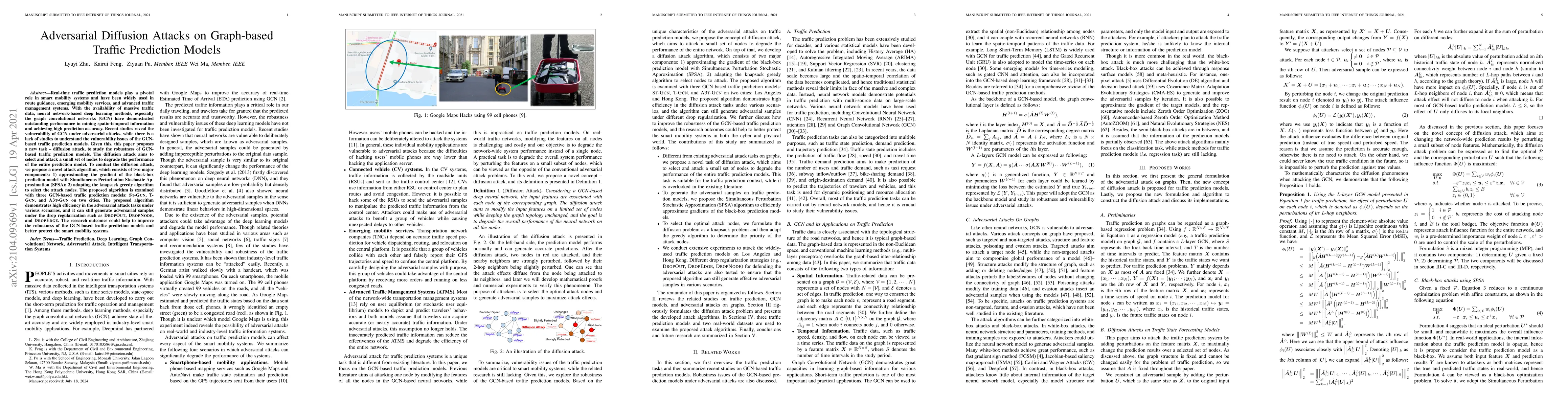 This paper investigates the vulnerability of graph convolutional network (GCN)-based traffic prediction models to adversarial attacks, proposing a novel diffusion attack method. The attack algorithm uses Simultaneous Perturbation Stochastic Approximation (SPSA) and a knapsack greedy algorithm to select a small set of nodes to degrade model performance, demonstrating effectiveness across various GCN models and regularization techniques.