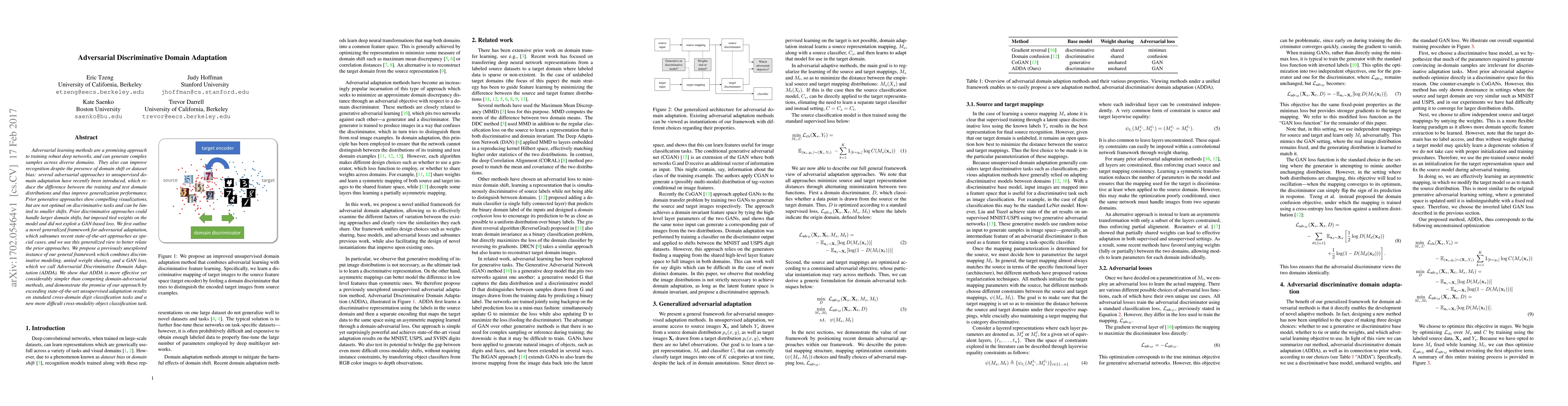 This paper introduces Adversarial Discriminative Domain Adaptation (ADDA), a novel framework combining discriminative modeling, untied weight sharing, and a GAN loss for effective unsupervised domain adaptation. The proposed method outperforms existing state-of-the-art approaches in cross-domain and cross-modality classification tasks.