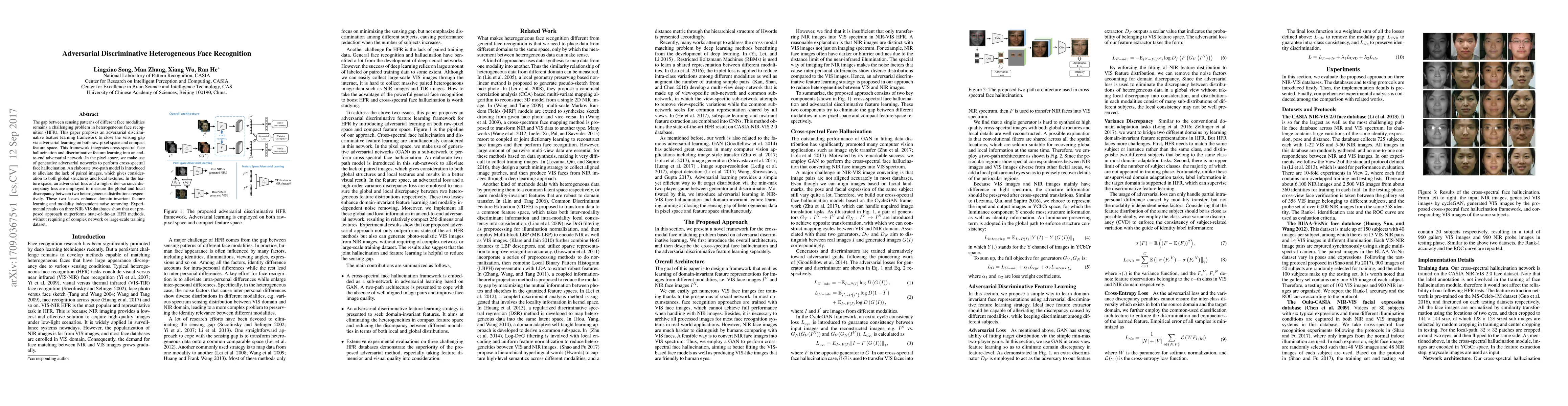 This paper proposes an adversarial discriminative framework to bridge the sensing gap in heterogeneous face recognition by integrating cross-spectral face hallucination and discriminative feature learning within an end-to-end adversarial network. Experimental results demonstrate superior performance over state-of-the-art methods on NIR-VIS databases.