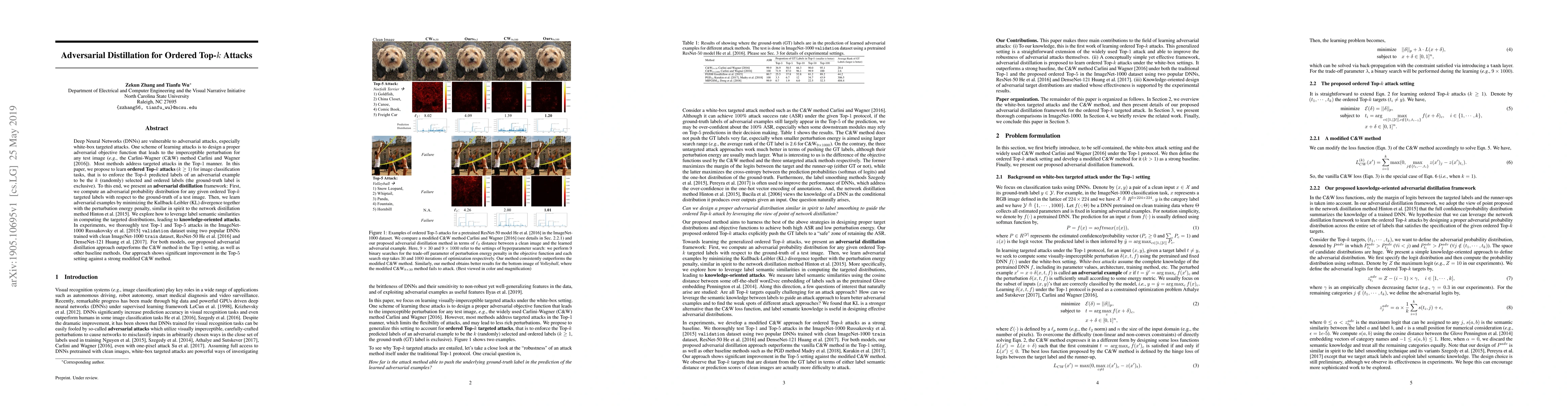 This paper proposes an adversarial distillation framework for learning ordered Top-k attacks (k>=1) in image classification, outperforming existing methods like the Carlini-Wagner method in both Top-1 and Top-5 settings on ImageNet-1000 using ResNet-50 and DenseNet-121. The approach leverages label semantic similarities and minimizes KL divergence with a perturbation penalty.