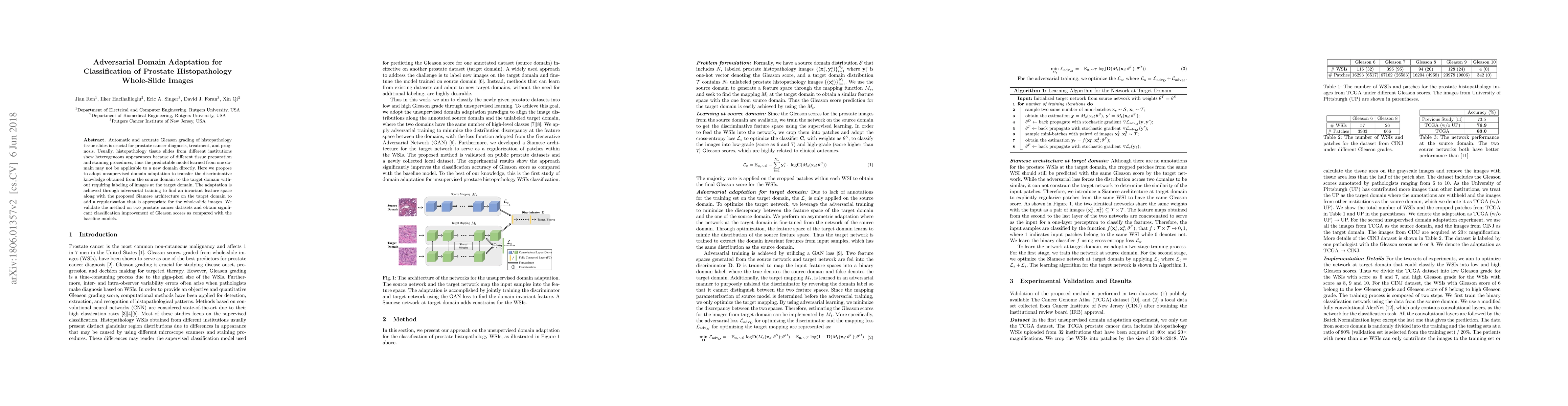 Automatic and accurate Gleason grading of histopathology tissue slides is crucial for prostate cancer diagnosis, treatment, and prognosis. Usually, histopathology tissue slides from different institutions show heterogeneous appearances because of different tissue preparation and staining procedures, thus the predictable model learned from one domain may not be applicable to a new domain directly. Here we propose to adopt unsupervised domain adaptation to transfer the discriminative knowledge obtained from the source domain to the target domain without requiring labeling of images at the target domain. The adaptation is achieved through adversarial training to find an invariant feature space along with the proposed Siamese architecture on the target domain to add a regularization that is appropriate for the whole-slide images. We validate the method on two prostate cancer datasets and obtain significant classification improvement of Gleason scores as compared with the baseline models.
