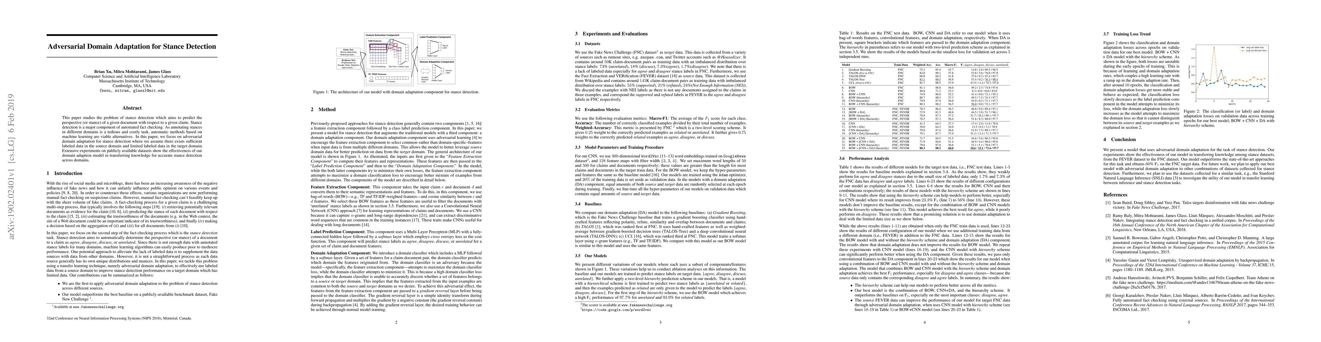 This paper proposes an adversarial domain adaptation method for stance detection, focusing on transferring knowledge from a well-labeled source domain to a less-labeled target domain. Experimental results demonstrate the model's effectiveness in improving stance detection accuracy across different domains.