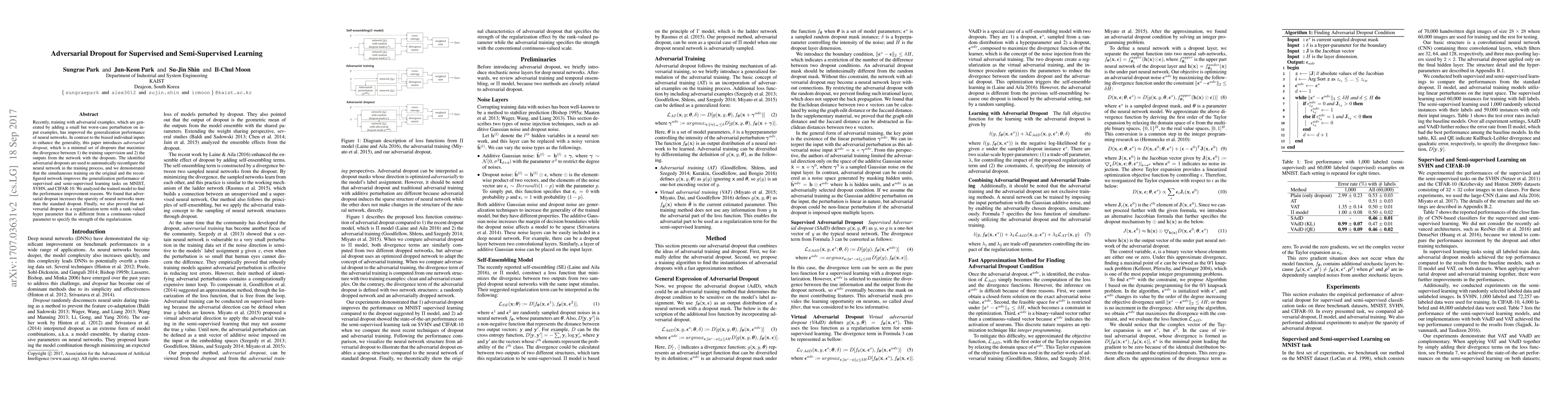 This paper proposes adversarial dropout, a method that identifies minimal dropouts to maximize divergence between network outputs and training labels, enhancing generalization in supervised and semi-supervised learning. Experiments on MNIST and CIFAR-10 show improved performance, attributed to increased network sparsity compared to standard dropout.