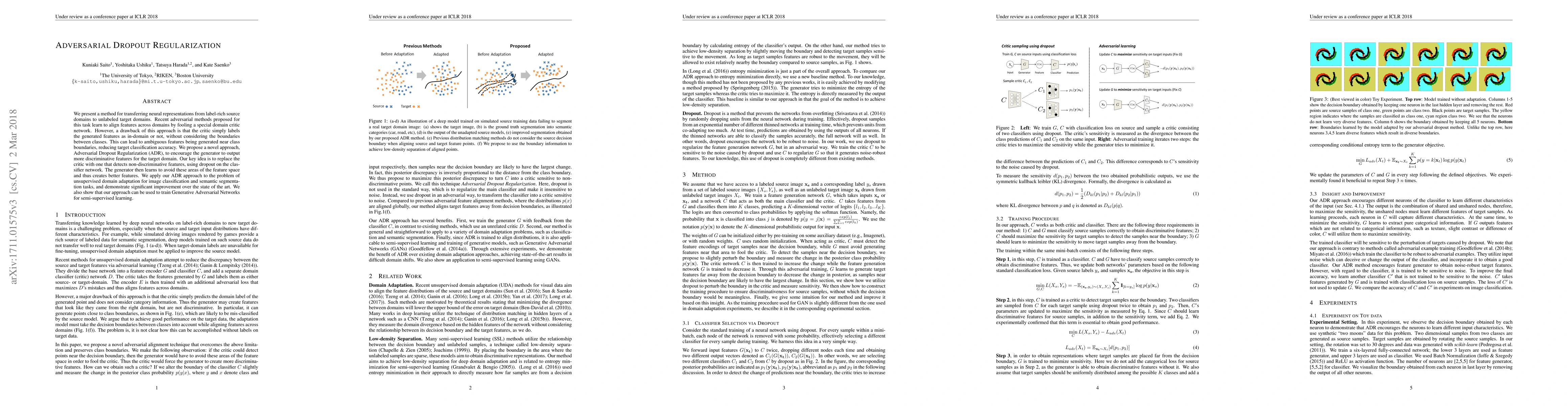 We present a method for transferring neural representations from label-rich source domains to unlabeled target domains. Recent adversarial methods proposed for this task learn to align features across domains by fooling a special domain critic network. However, a drawback of this approach is that the critic simply labels the generated features as in-domain or not, without considering the boundaries between classes. This can lead to ambiguous features being generated near class boundaries, reducing target classification accuracy. We propose a novel approach, Adversarial Dropout Regularization (ADR), to encourage the generator to output more discriminative features for the target domain. Our key idea is to replace the critic with one that detects non-discriminative features, using dropout on the classifier network. The generator then learns to avoid these areas of the feature space and thus creates better features. We apply our ADR approach to the problem of unsupervised domain adaptation for image classification and semantic segmentation tasks, and demonstrate significant improvement over the state of the art. We also show that our approach can be used to train Generative Adversarial Networks for semi-supervised learning.