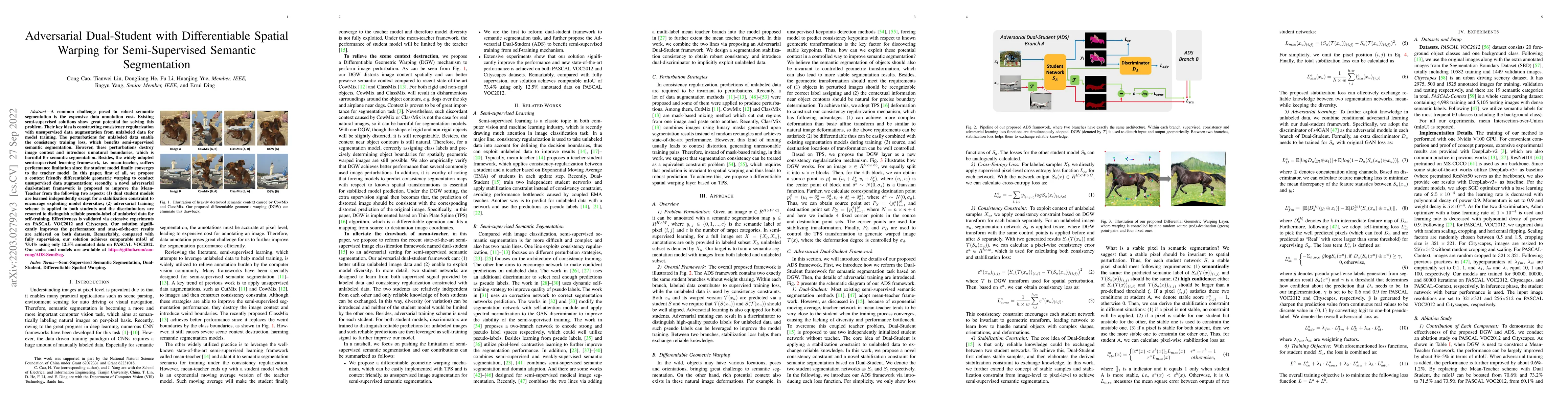 This paper proposes an Adversarial Dual-Student framework with differentiable spatial warping for semi-supervised semantic segmentation to address the high data annotation cost. It introduces context-friendly geometric warping and an adversarial training scheme to improve the Mean-Teacher model, achieving state-of-the-art results on PASCAL VOC2012 and Cityscapes with only 12.5% annotated data.