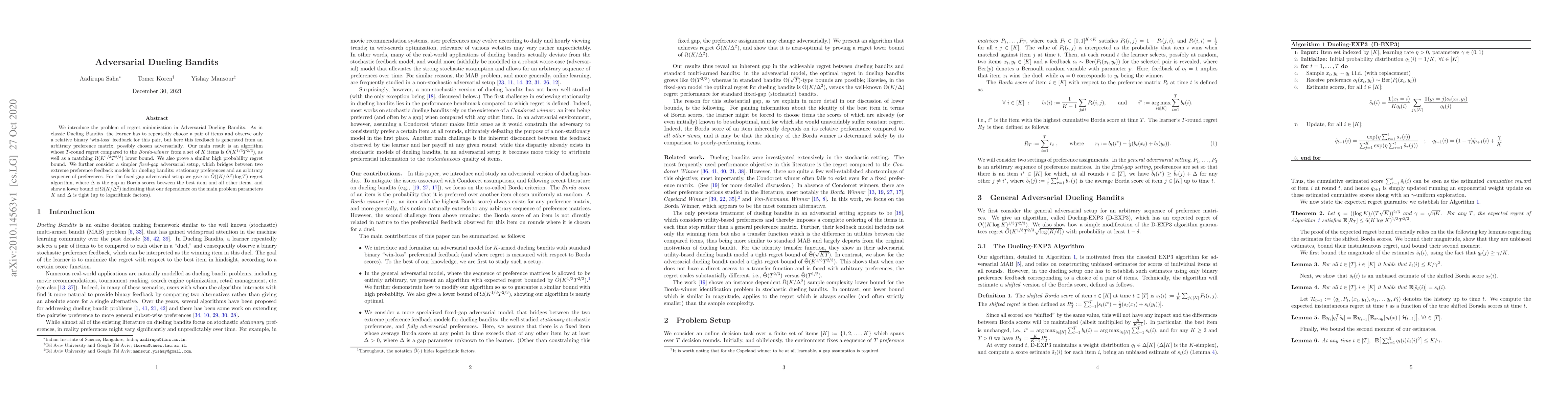 This paper addresses regret minimization in Adversarial Dueling Bandits, where learners choose item pairs and receive relative win-loss feedback from an adversarial preference matrix. The authors propose an algorithm achieving a $T$-round regret of $\tilde{O}(K^{1/3}T^{2/3})$, with a matching lower bound, and a fixed-gap algorithm with $\tilde{O}((K/\Delta^2)\log{T})$ regret, demonstrating tight parameter dependence.