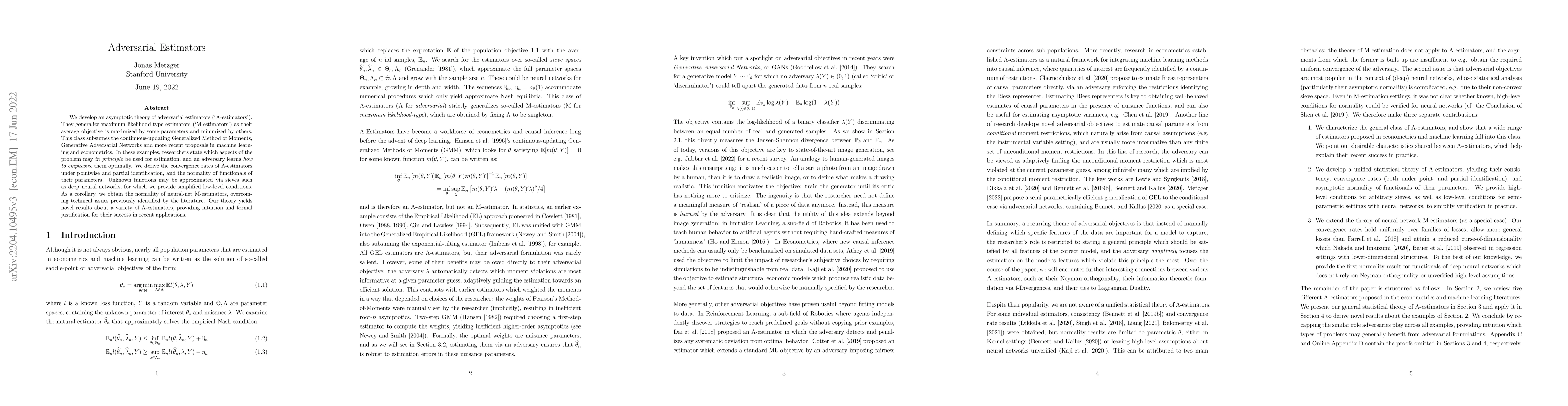 We develop an asymptotic theory of adversarial estimators ('A-estimators'). They generalize maximum-likelihood-type estimators ('M-estimators') as their average objective is maximized by some parameters and minimized by others. This class subsumes the continuous-updating Generalized Method of Moments, Generative Adversarial Networks and more recent proposals in machine learning and econometrics. In these examples, researchers state which aspects of the problem may in principle be used for estimation, and an adversary learns how to emphasize them optimally. We derive the convergence rates of A-estimators under pointwise and partial identification, and the normality of functionals of their parameters. Unknown functions may be approximated via sieves such as deep neural networks, for which we provide simplified low-level conditions. As a corollary, we obtain the normality of neural-net M-estimators, overcoming technical issues previously identified by the literature. Our theory yields novel results about a variety of A-estimators, providing intuition and formal justification for their success in recent applications.