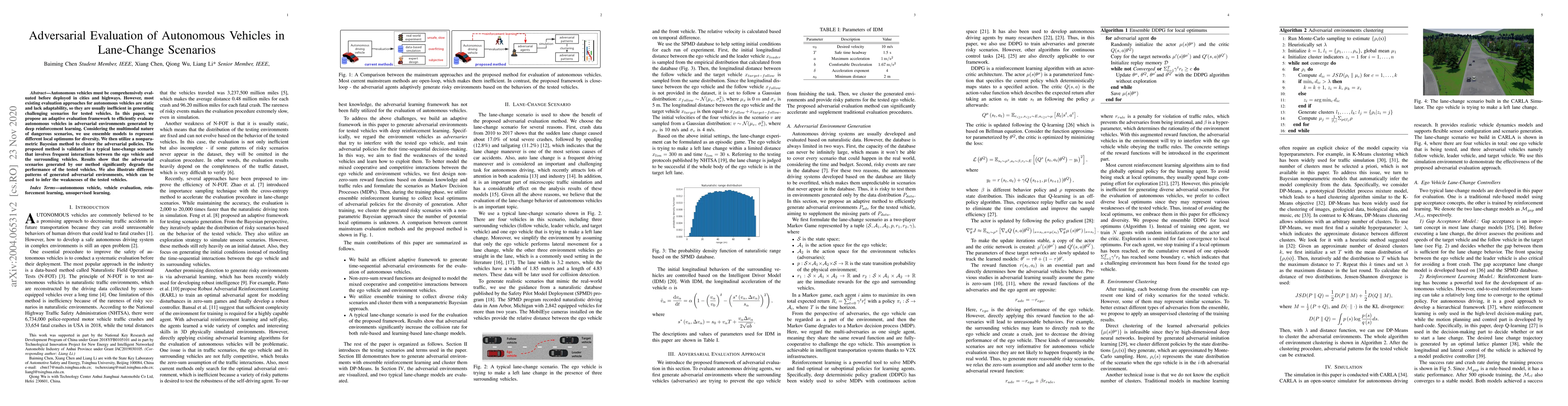 This paper proposes an adaptive evaluation framework using deep reinforcement learning to generate adversarial scenarios for testing autonomous vehicles in lane-change scenarios. The method employs ensemble models and nonparametric Bayesian clustering to create diverse and challenging scenarios, revealing the weaknesses of the tested vehicles.