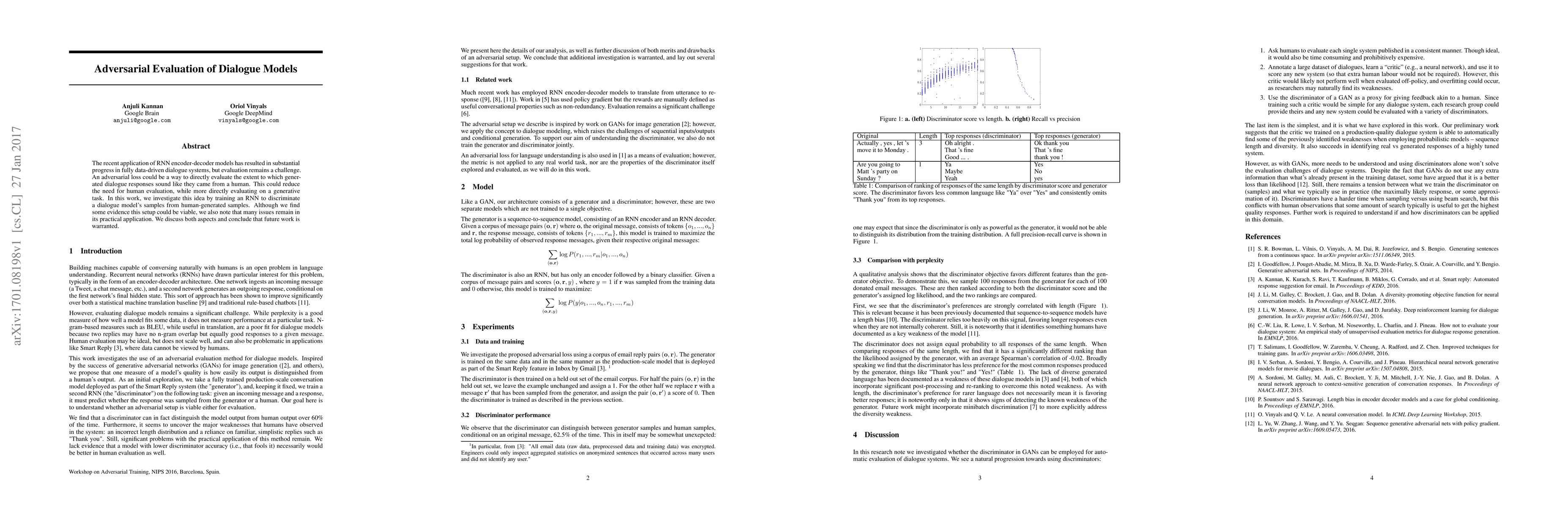 Researchers investigated using an adversarial loss to evaluate dialogue models, finding it could help directly assess generated responses, but also highlights challenges in its practical application.