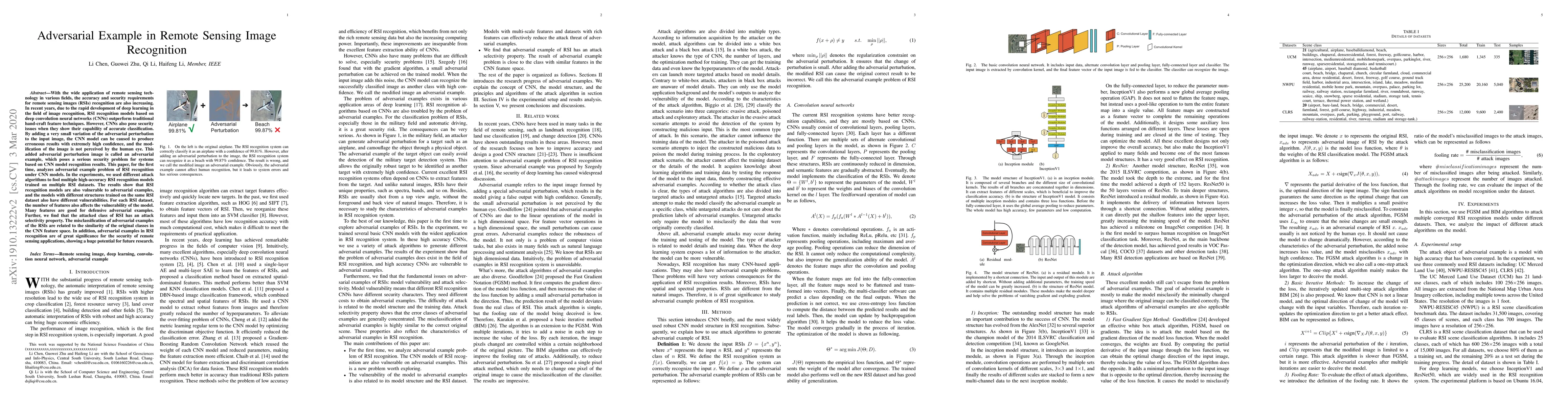This paper investigates the vulnerability of remote sensing image (RSI) recognition models based on deep convolutional neural networks (CNNs) to adversarial examples. Experiments reveal that RSI recognition models are susceptible to adversarial perturbations, with varying vulnerabilities depending on model structure and dataset features, highlighting significant security concerns for remote sensing applications.