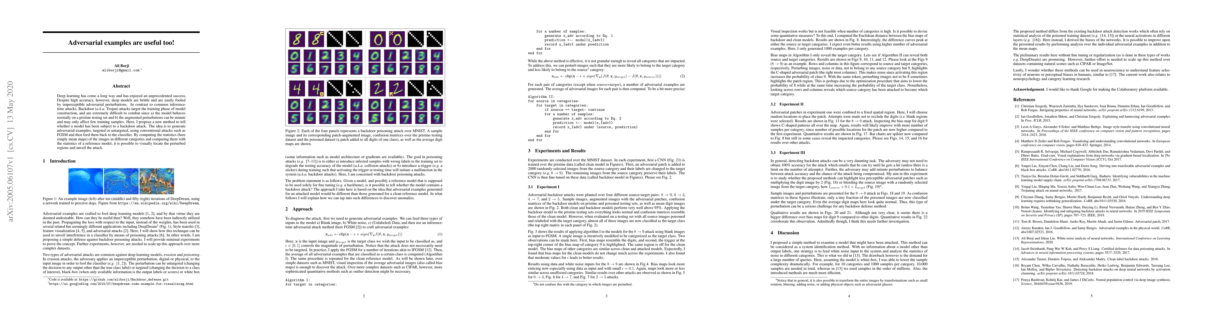 Deep learning has come a long way and has enjoyed an unprecedented success. Despite high accuracy, however, deep models are brittle and are easily fooled by imperceptible adversarial perturbations. In contrast to common inference-time attacks, Backdoor (\aka Trojan) attacks target the training phase of model construction, and are extremely difficult to combat since a) the model behaves normally on a pristine testing set and b) the augmented perturbations can be minute and may only affect few training samples. Here, I propose a new method to tell whether a model has been subject to a backdoor attack. The idea is to generate adversarial examples, targeted or untargeted, using conventional attacks such as FGSM and then feed them back to the classifier. By computing the statistics (here simply mean maps) of the images in different categories and comparing them with the statistics of a reference model, it is possible to visually locate the perturbed regions and unveil the attack.