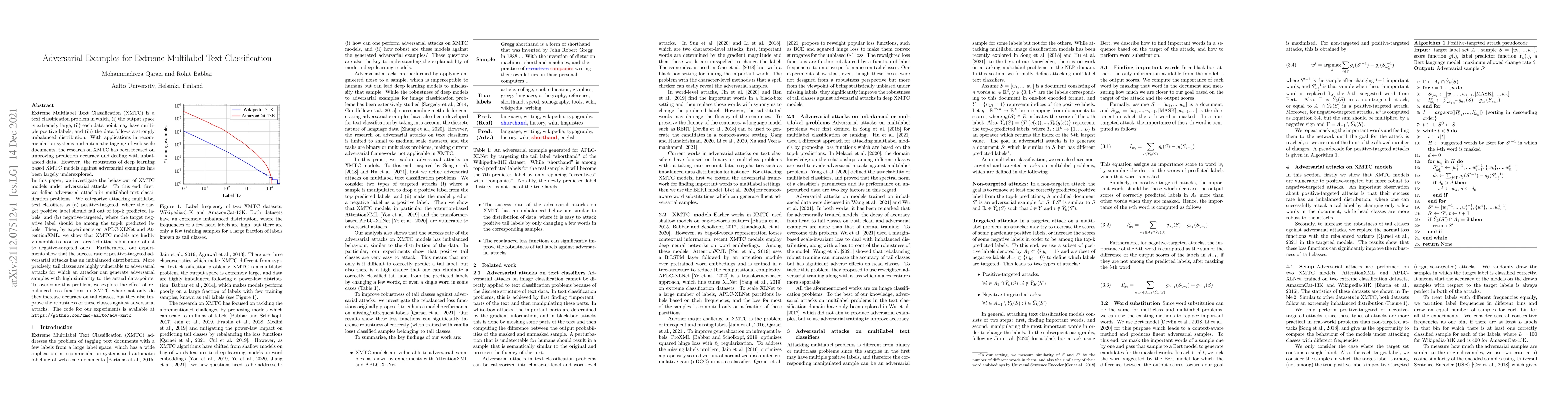 This paper investigates the vulnerability of Extreme Multilabel Text Classification (XMTC) models to adversarial attacks, showing that they are highly susceptible to positive-targeted attacks but more resilient to negative-targeted ones. The study also reveals that tail classes in imbalanced data are particularly vulnerable, and rebalanced loss functions can improve both accuracy and robustness against adversarial examples.