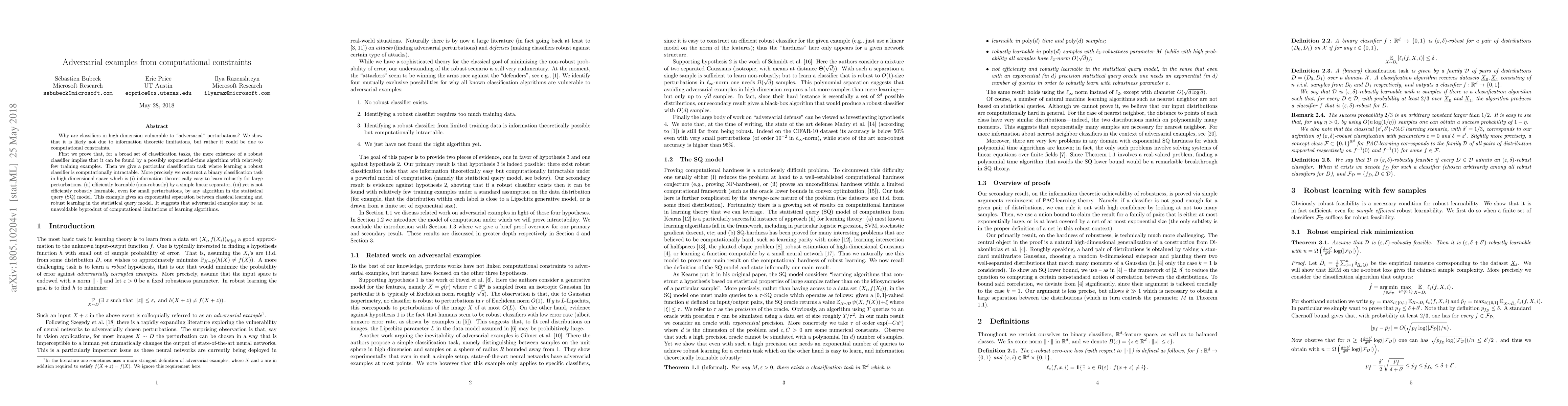 Why are classifiers in high dimension vulnerable to "adversarial" perturbations? We show that it is likely not due to information theoretic limitations, but rather it could be due to computational constraints. First we prove that, for a broad set of classification tasks, the mere existence of a robust classifier implies that it can be found by a possibly exponential-time algorithm with relatively few training examples. Then we give a particular classification task where learning a robust classifier is computationally intractable. More precisely we construct a binary classification task in high dimensional space which is (i) information theoretically easy to learn robustly for large perturbations, (ii) efficiently learnable (non-robustly) by a simple linear separator, (iii) yet is not efficiently robustly learnable, even for small perturbations, by any algorithm in the statistical query (SQ) model. This example gives an exponential separation between classical learning and robust learning in the statistical query model. It suggests that adversarial examples may be an unavoidable byproduct of computational limitations of learning algorithms.