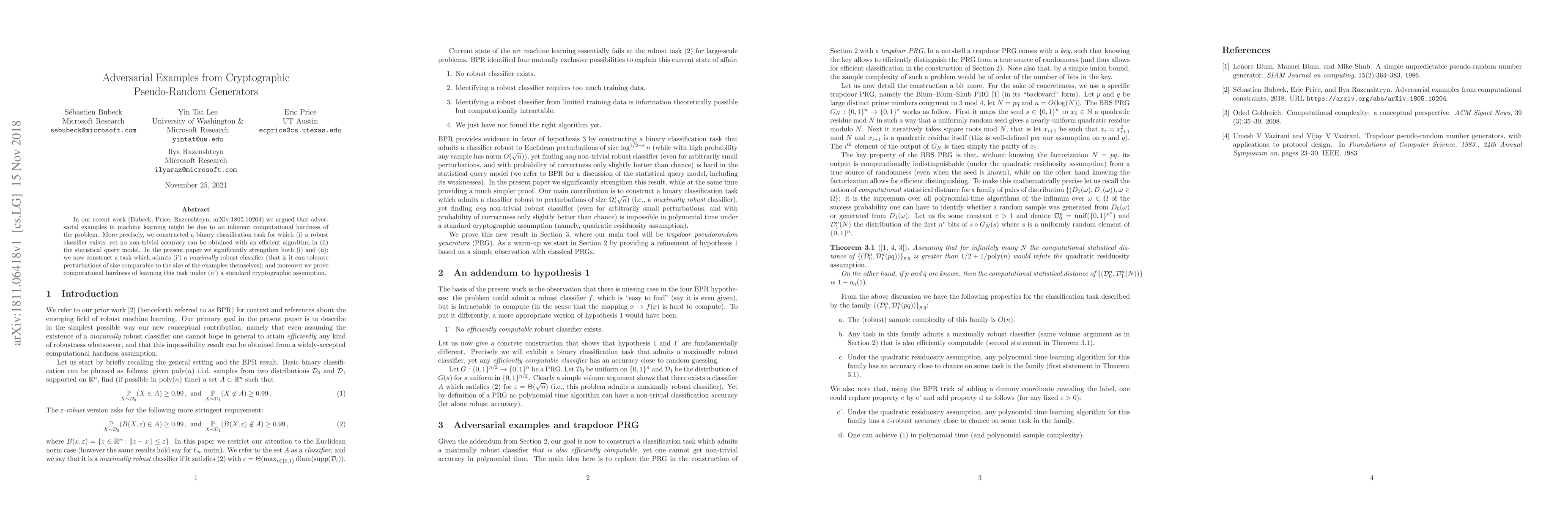 In our recent work (Bubeck, Price, Razenshteyn, arXiv:1805.10204) we argued that adversarial examples in machine learning might be due to an inherent computational hardness of the problem. More precisely, we constructed a binary classification task for which (i) a robust classifier exists; yet no non-trivial accuracy can be obtained with an efficient algorithm in (ii) the statistical query model. In the present paper we significantly strengthen both (i) and (ii): we now construct a task which admits (i') a maximally robust classifier (that is it can tolerate perturbations of size comparable to the size of the examples themselves); and moreover we prove computational hardness of learning this task under (ii') a standard cryptographic assumption.