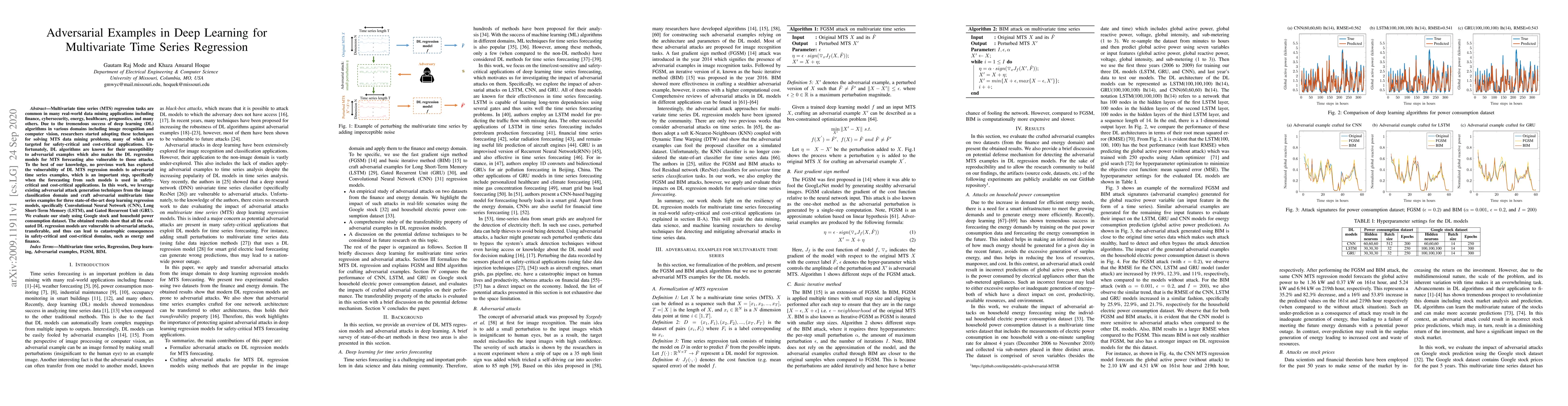 This paper investigates the vulnerability of deep learning regression models for multivariate time series forecasting to adversarial examples, demonstrating that CNN, LSTM, and GRU models are susceptible to such attacks, which can lead to severe consequences in safety-critical applications like finance and energy.