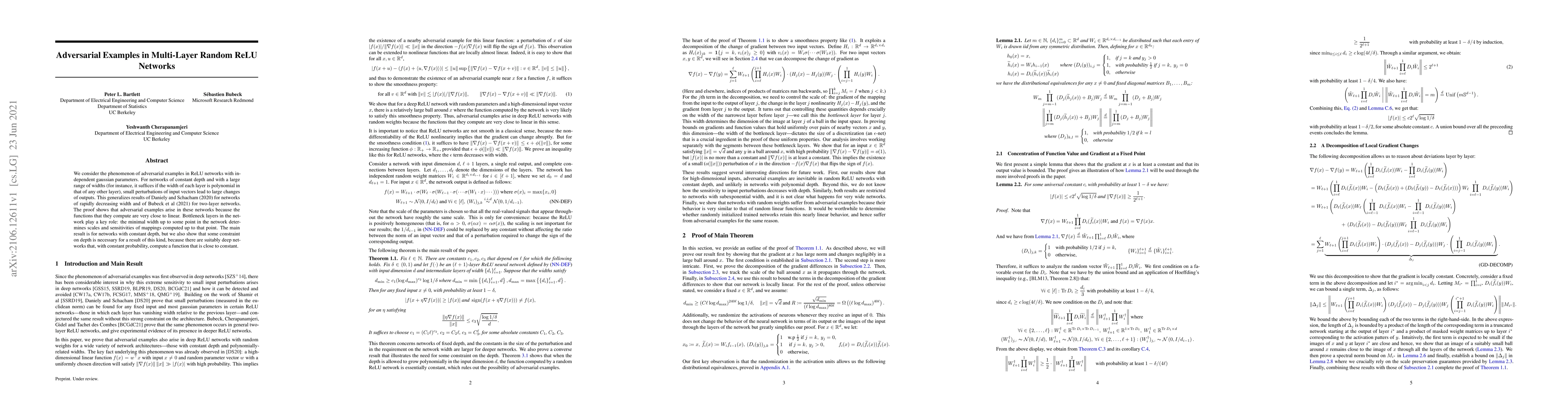 This paper investigates the susceptibility of multi-layer ReLU networks with Gaussian parameters to adversarial examples, demonstrating that small input perturbations can cause large output changes. The study highlights the importance of bottleneck layers in determining the network's sensitivity and shows that adversarial examples arise due to the networks' near-linear functions.