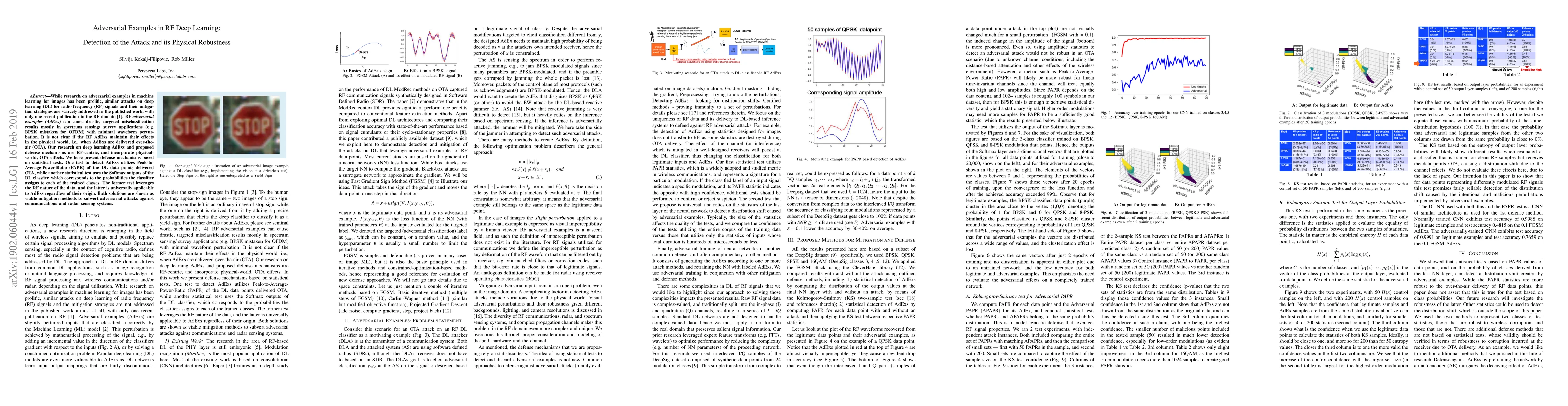 This paper investigates the detection and physical robustness of adversarial examples in RF deep learning, focusing on spectrum sensing applications. It proposes defense mechanisms based on statistical tests, including one that uses the Peak-to-Average-Power-Ratio of RF data and another that analyzes Softmax outputs, to effectively mitigate RF adversarial attacks.