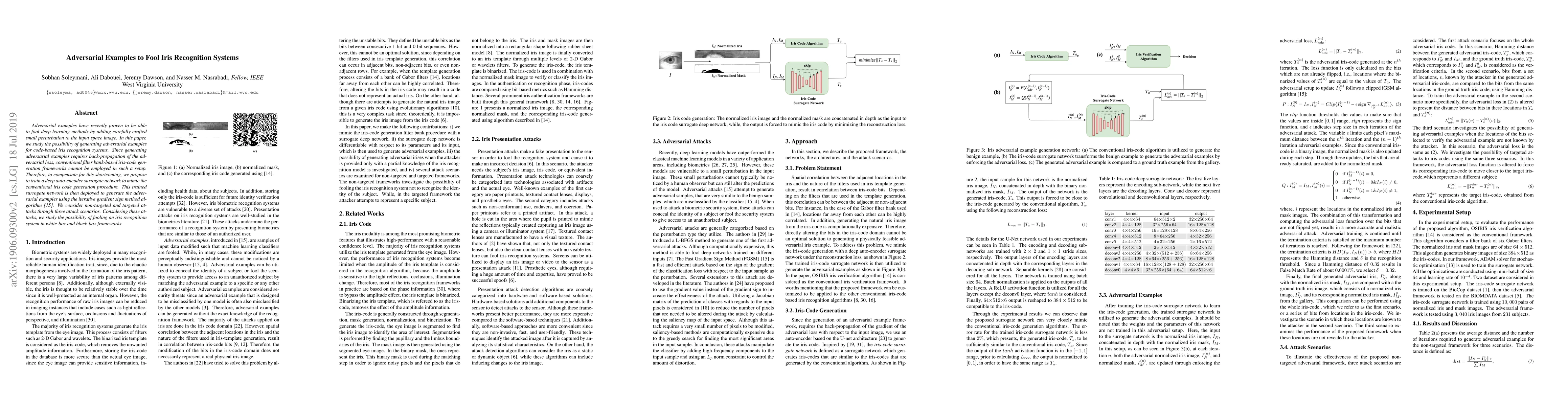 This paper investigates generating adversarial examples to deceive code-based iris recognition systems by training a deep auto-encoder to mimic conventional iris code generation. The surrogate network is used to create adversarial examples via the iterative gradient sign method, exploring both non-targeted and targeted attacks in white-box and black-box settings.