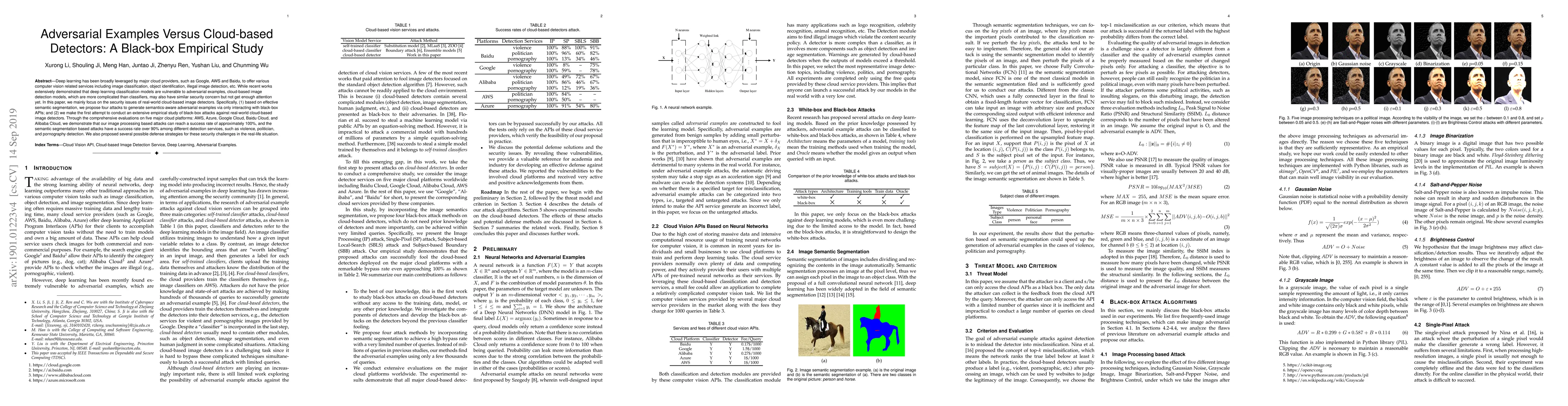 Deep learning has been broadly leveraged by major cloud providers, such as Google, AWS and Baidu, to offer various computer vision related services including image classification, object identification, illegal image detection, etc. While recent works extensively demonstrated that deep learning classification models are vulnerable to adversarial examples, cloud-based image detection models, which are more complicated than classifiers, may also have similar security concern but not get enough attention yet. In this paper, we mainly focus on the security issues of real-world cloud-based image detectors. Specifically, (1) based on effective semantic segmentation, we propose four attacks to generate semantics-aware adversarial examples via only interacting with black-box APIs; and (2) we make the first attempt to conduct an extensive empirical study of black-box attacks against real-world cloud-based image detectors. Through the comprehensive evaluations on five major cloud platforms: AWS, Azure, Google Cloud, Baidu Cloud, and Alibaba Cloud, we demonstrate that our image processing based attacks can reach a success rate of approximately 100%, and the semantic segmentation based attacks have a success rate over 90% among different detection services, such as violence, politician, and pornography detection. We also proposed several possible defense strategies for these security challenges in the real-life situation.