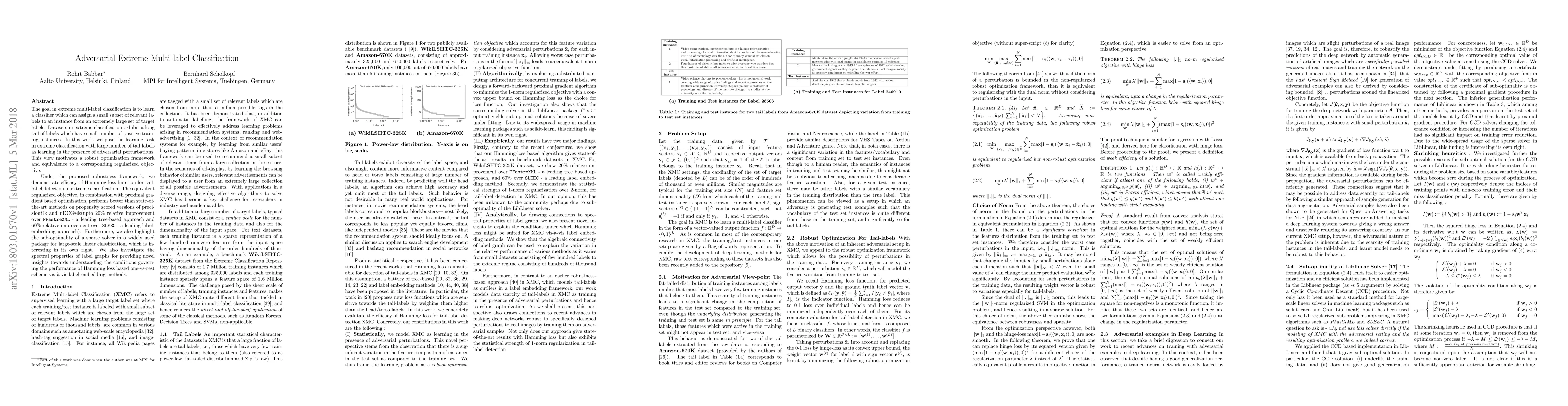 This paper proposes a robust optimization framework for extreme multi-label classification, framing it as learning in the presence of adversarial perturbations. The method leverages Hamming loss for tail-label detection and achieves significant improvements over state-of-the-art approaches, highlighting the sub-optimality of sparse solvers in large-scale linear classification.