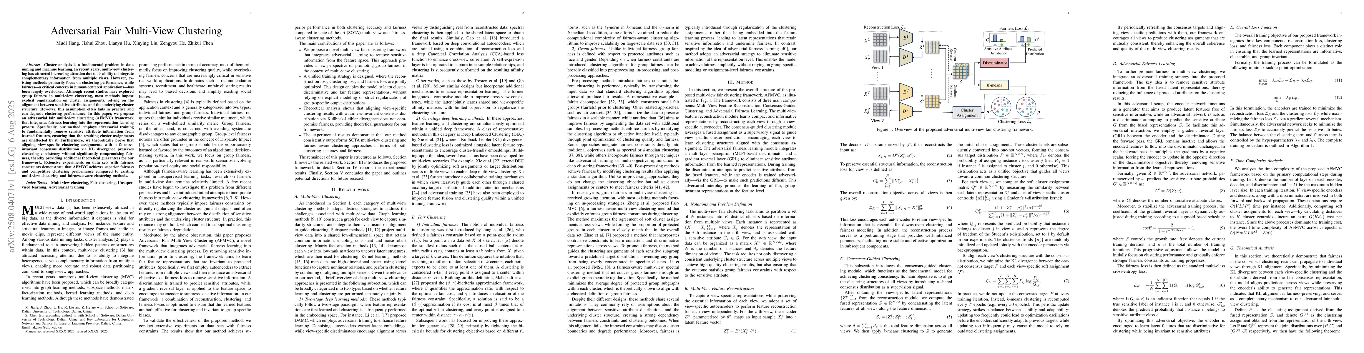 Cluster analysis is a fundamental problem in data mining and machine learning. In recent years, multi-view clustering has attracted increasing attention due to its ability to integrate complementary information from multiple views. However, existing methods primarily focus on clustering performance, while fairness-a critical concern in human-centered applications-has been largely overlooked. Although recent studies have explored group fairness in multi-view clustering, most methods impose explicit regularization on cluster assignments, relying on the alignment between sensitive attributes and the underlying cluster structure. However, this assumption often fails in practice and can degrade clustering performance. In this paper, we propose an adversarial fair multi-view clustering (AFMVC) framework that integrates fairness learning into the representation learning process. Specifically, our method employs adversarial training to fundamentally remove sensitive attribute information from learned features, ensuring that the resulting cluster assignments are unaffected by it. Furthermore, we theoretically prove that aligning view-specific clustering assignments with a fairness-invariant consensus distribution via KL divergence preserves clustering consistency without significantly compromising fairness, thereby providing additional theoretical guarantees for our framework. Extensive experiments on data sets with fairness constraints demonstrate that AFMVC achieves superior fairness and competitive clustering performance compared to existing multi-view clustering and fairness-aware clustering methods.