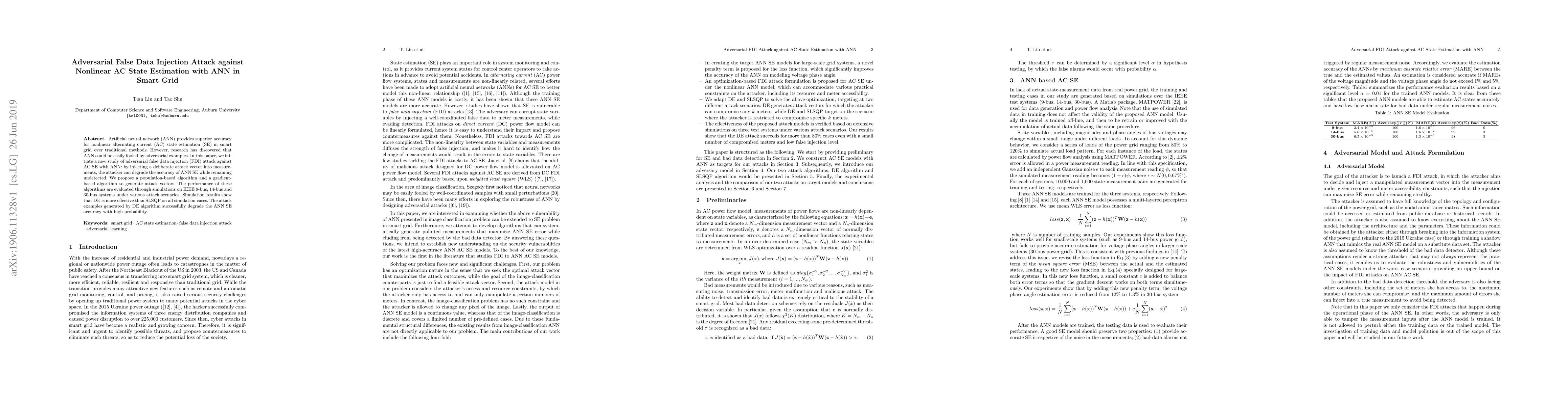 This paper investigates adversarial false data injection attacks against artificial neural network (ANN)-based AC state estimation in smart grids, proposing population-based and gradient-based algorithms to generate attack vectors. Simulation results on IEEE 9-bus, 14-bus, and 30-bus systems show that the population-based algorithm is more effective than the gradient-based one, successfully degrading ANN accuracy.