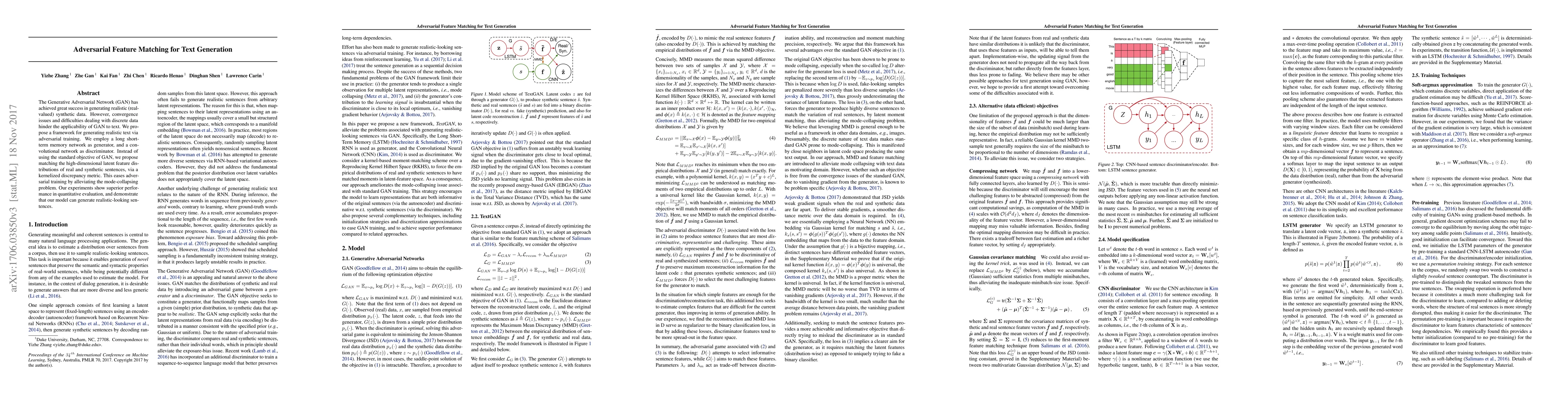 This paper proposes a GAN framework for text generation using adversarial feature matching to address convergence issues and mode-collapsing problems. It employs an LSTM generator and a convolutional discriminator, and uses a kernelized discrepancy metric to match latent feature distributions, achieving superior performance in generating realistic sentences.