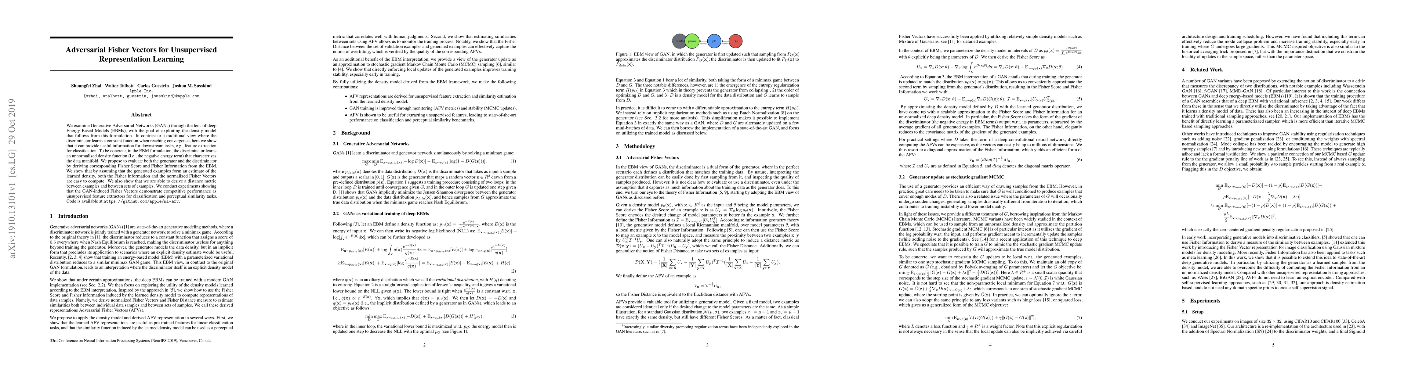 We examine Generative Adversarial Networks (GANs) through the lens of deep Energy Based Models (EBMs), with the goal of exploiting the density model that follows from this formulation. In contrast to a traditional view where the discriminator learns a constant function when reaching convergence, here we show that it can provide useful information for downstream tasks, e.g., feature extraction for classification. To be concrete, in the EBM formulation, the discriminator learns an unnormalized density function (i.e., the negative energy term) that characterizes the data manifold. We propose to evaluate both the generator and the discriminator by deriving corresponding Fisher Score and Fisher Information from the EBM. We show that by assuming that the generated examples form an estimate of the learned density, both the Fisher Information and the normalized Fisher Vectors are easy to compute. We also show that we are able to derive a distance metric between examples and between sets of examples. We conduct experiments showing that the GAN-induced Fisher Vectors demonstrate competitive performance as unsupervised feature extractors for classification and perceptual similarity tasks. Code is available at \url{https://github.com/apple/ml-afv}.