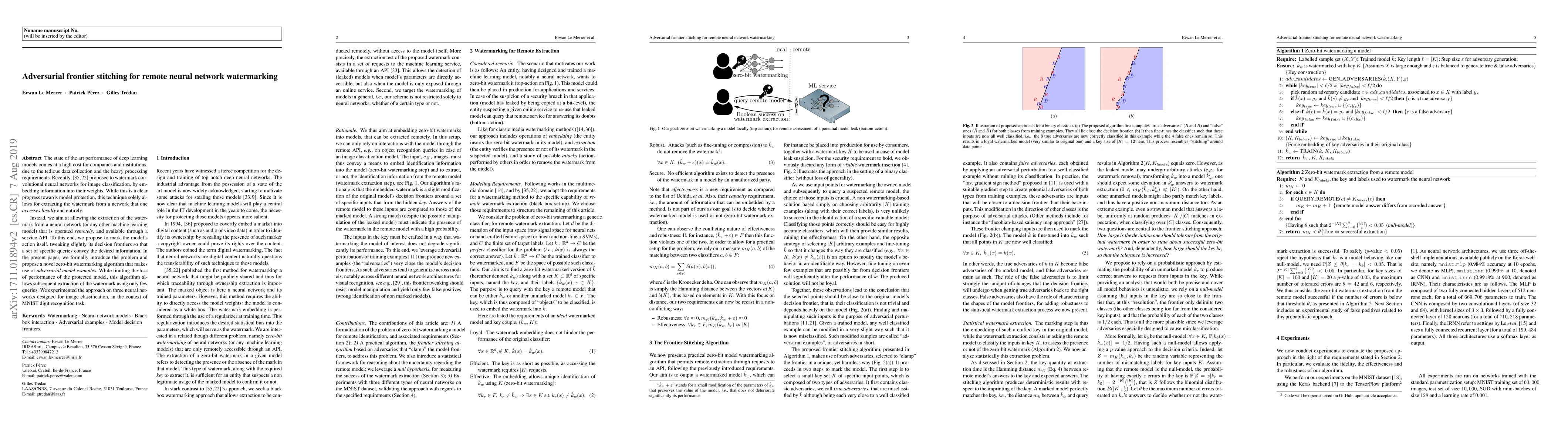 This paper introduces a novel method, Adversarial Frontier Stitching, for remote watermarking of neural networks used in image classification tasks like MNIST. The technique embeds watermarks by subtly altering the model's decision boundaries, allowing for watermark extraction using only a few queries without significantly impacting model performance.