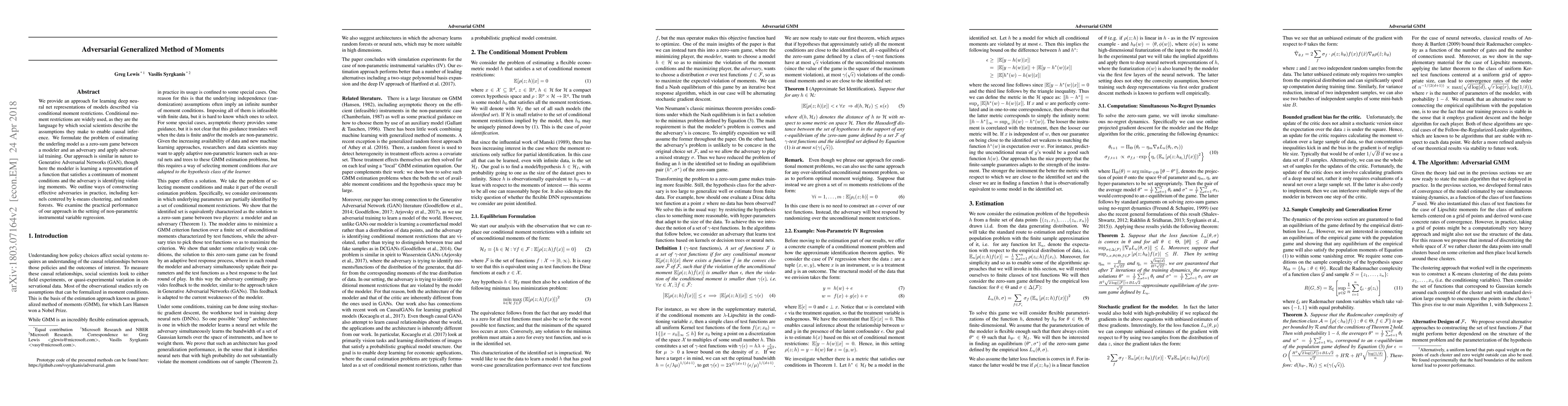 We provide an approach for learning deep neural net representations of models described via conditional moment restrictions. Conditional moment restrictions are widely used, as they are the language by which social scientists describe the assumptions they make to enable causal inference. We formulate the problem of estimating the underling model as a zero-sum game between a modeler and an adversary and apply adversarial training. Our approach is similar in nature to Generative Adversarial Networks (GAN), though here the modeler is learning a representation of a function that satisfies a continuum of moment conditions and the adversary is identifying violating moments. We outline ways of constructing effective adversaries in practice, including kernels centered by k-means clustering, and random forests. We examine the practical performance of our approach in the setting of non-parametric instrumental variable regression.