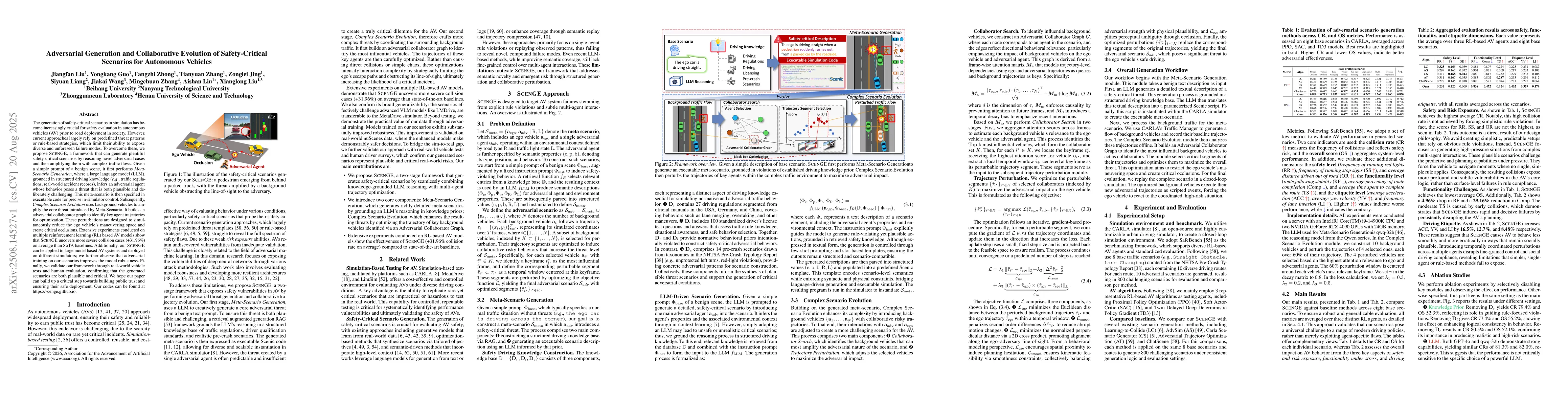 The paper introduces ScenGE, a two-stage framework for generating safety-critical scenarios for autonomous vehicles. It combines Meta-Scenario Generation using a large language model grounded in structured driving knowledge with Complex Scenario Evolution that amplifies threats using background traffic flows.