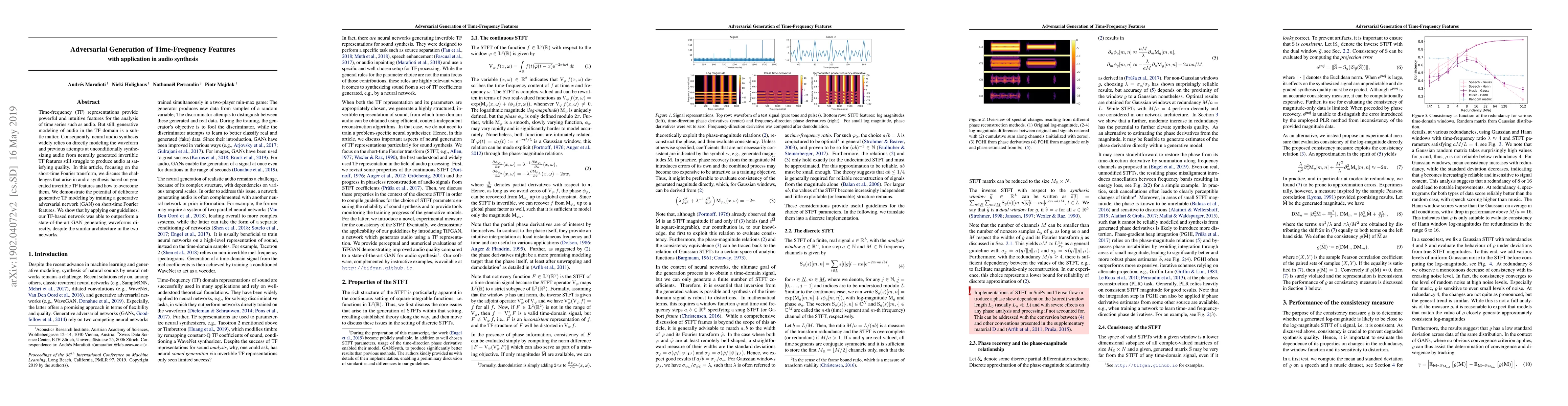 This paper explores the challenges of generating high-quality audio through adversarial modeling of time-frequency (TF) features, specifically using the short-time Fourier transform. It demonstrates that a GAN trained on TF features can outperform a GAN modeling waveforms directly, despite similar architectures.