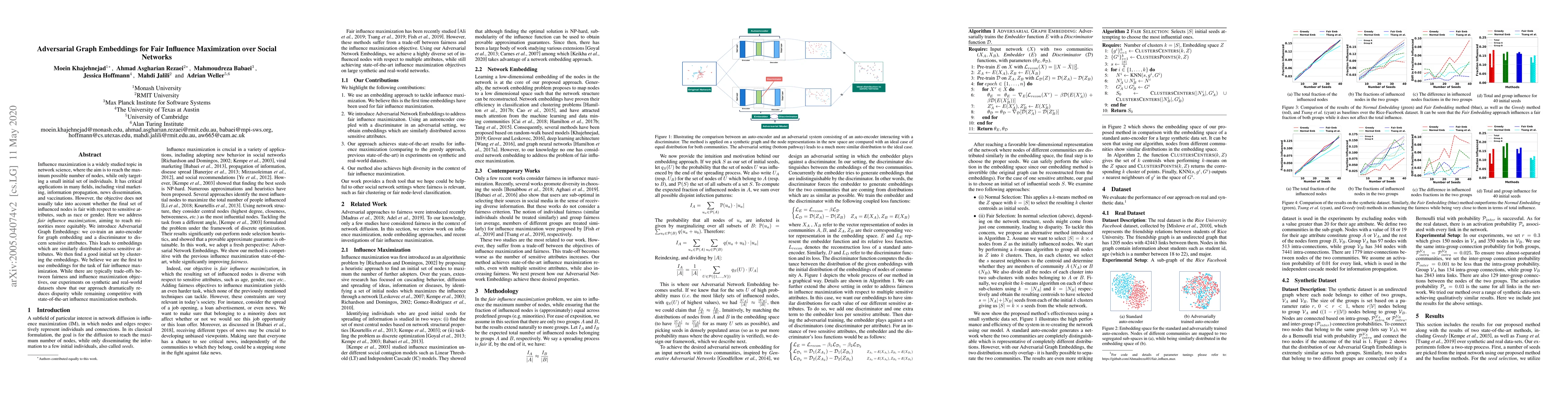 This paper introduces Adversarial Graph Embeddings to achieve fair influence maximization over social networks, balancing equitable reach to minorities against sensitive attributes. The method co-trains an auto-encoder and discriminator to create fair graph embeddings, followed by clustering to identify optimal initial nodes, demonstrating reduced disparity without sacrificing influence maximization performance.