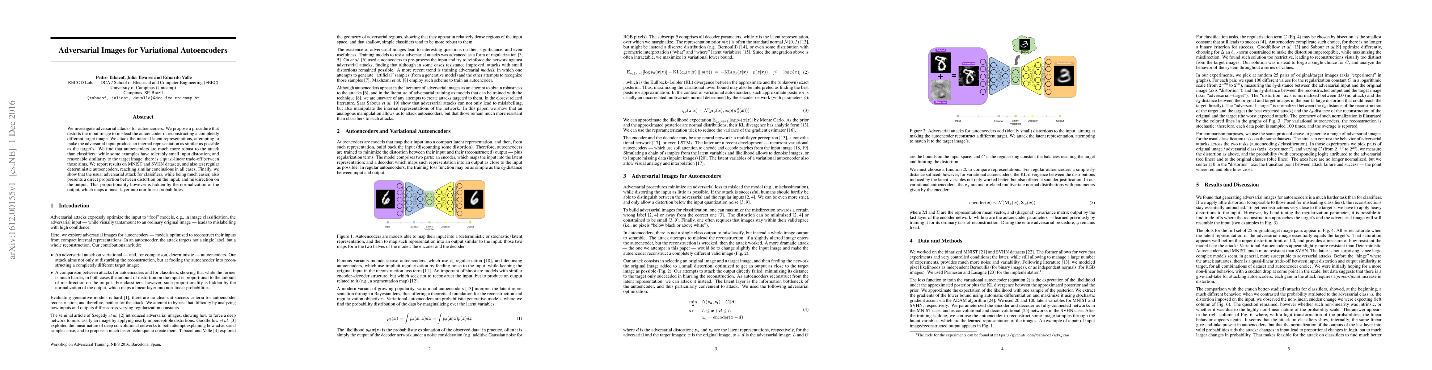 This paper explores adversarial attacks on variational autoencoders, proposing a method to distort inputs to mislead reconstructions into different target images. It finds that autoencoders are more robust than classifiers, showing a quasi-linear trade-off between input distortion and target image similarity, with results consistent across MNIST and SVHN datasets.